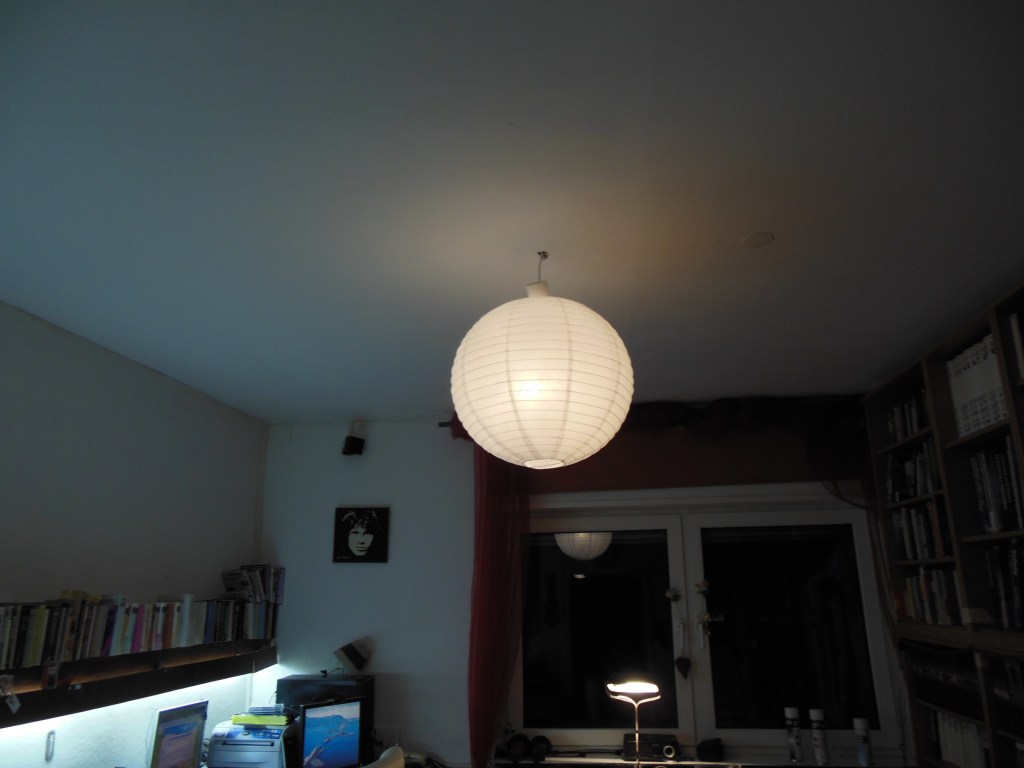 So, jetzt waren wir ein wenig Geld unter die Leute bringen. Ich habe mir eine neue Lampe für das Wohnzimmer gekauft. Die Tatsache dass es jetzt noch dunkler ist weil das Ding noch mehr Licht abschirmt als die Alte weiss Ich noch nicht einzuordenen in Vorteil oder Nachteil. Mir jedenfalls gefällts. Im Moment. Auérdem kann man für ca. 6 Euro nicht virl verkehrt machen.