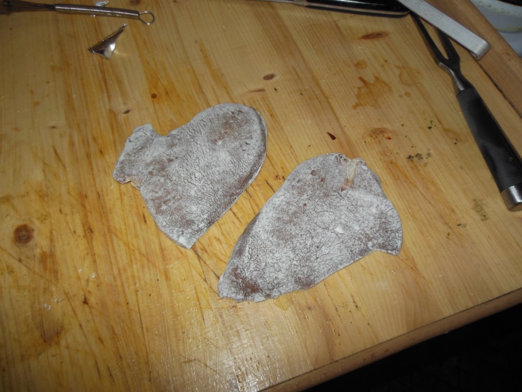 Nun muss man die Leber in Mehl wenden und in Butter auf beiden Seiten anbraten. Darauf achten dass die Butter nicht verbrennt.