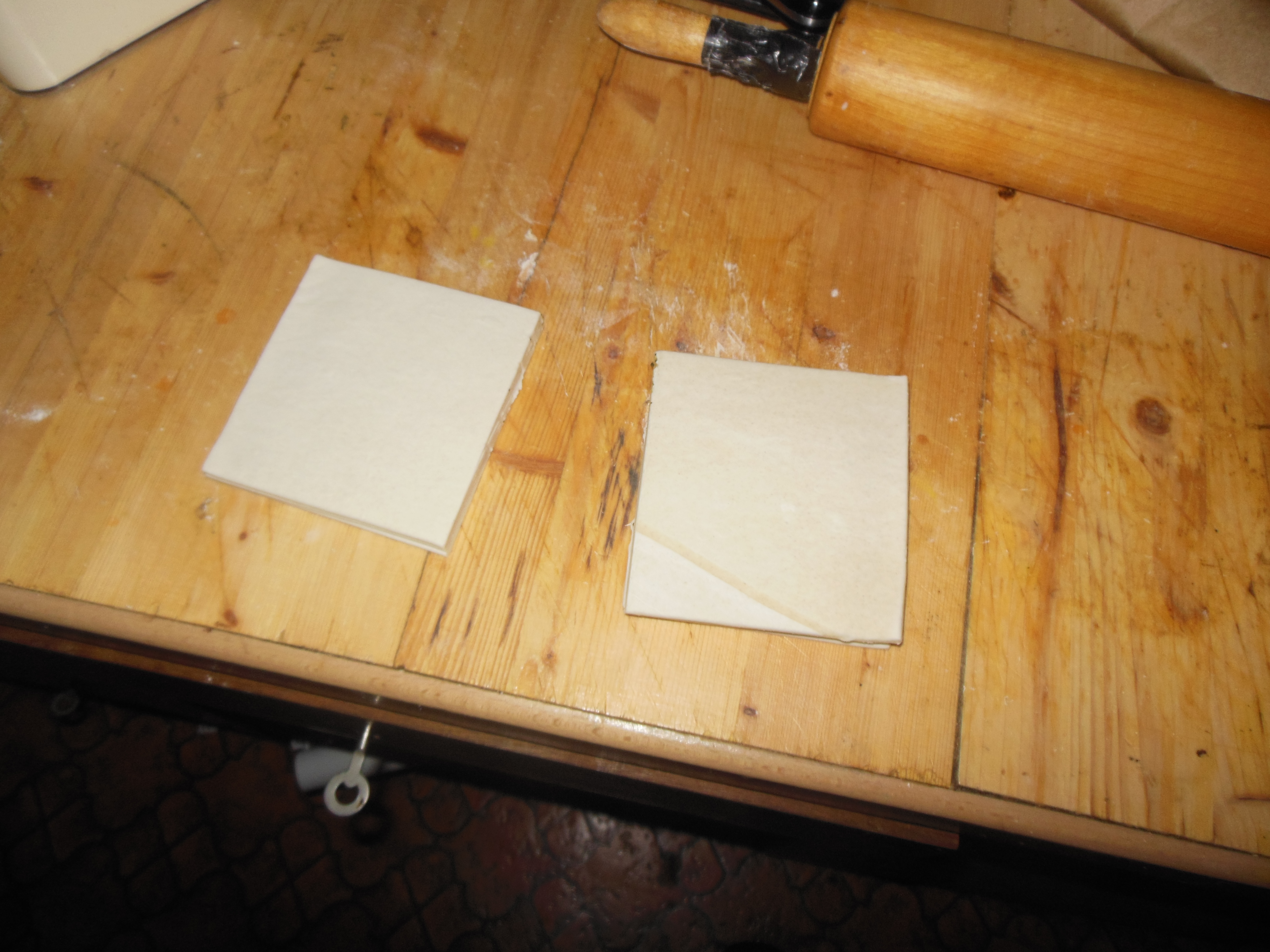 Zuerst muss man die Blätterteigplatten auftauen lassen und in der Mitte durchschneiden.