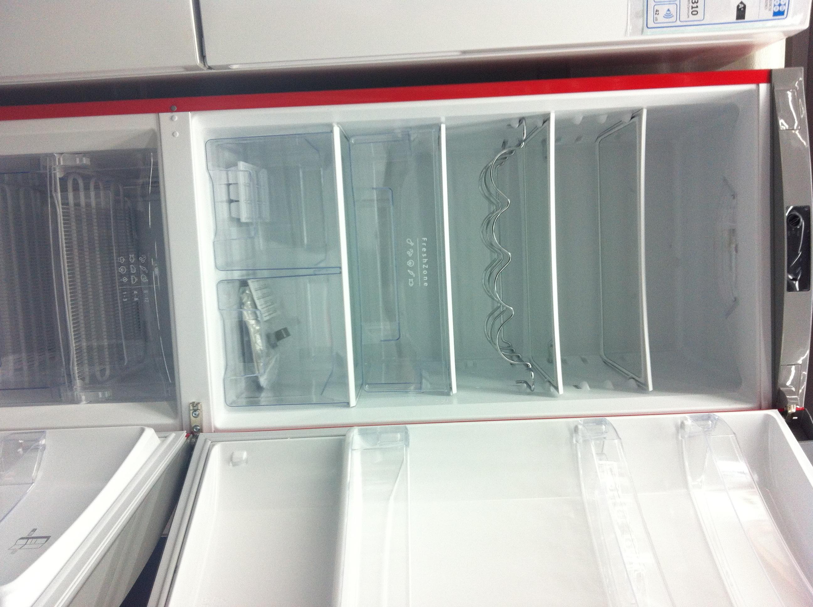 Ein Modell von Gorenje in Feuerrot mit drei riesigen Ablagen, drei Gemüsefächern und drei Gefrierschubladen.