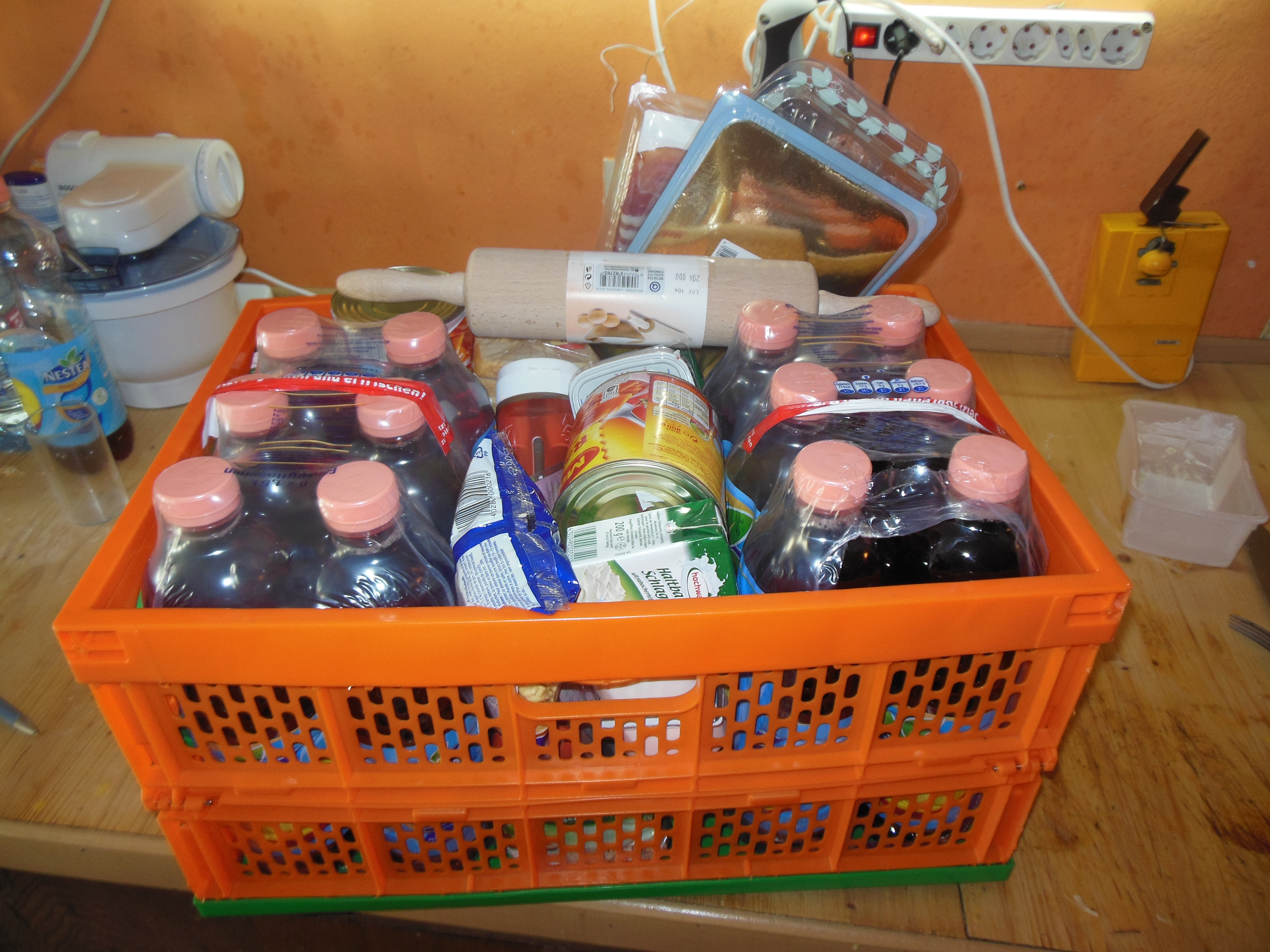 Wie man auf den ersten Blick erkennen kann, lauter gesunde Sachen. Eistee, Sahne, Ravioli…..