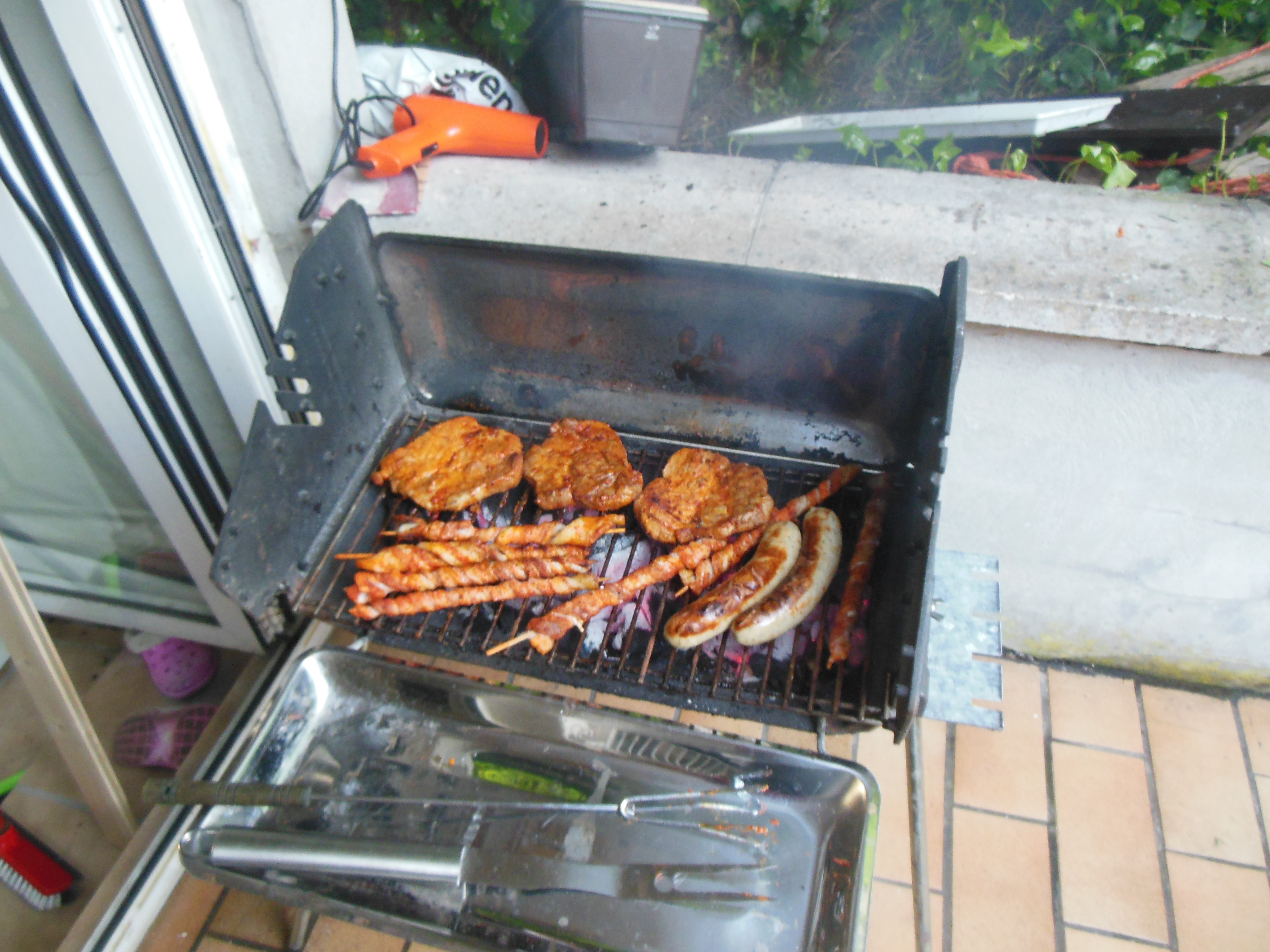 Ja, am Abend haben wir dann endlich den Grill eingeweiht. Ich war noch kurz im Praktiker, habe das Material für die Markise besorgt und mein Onkel hat das Fleisch organisiert und den Nudelsalat gemacht.