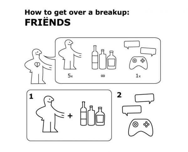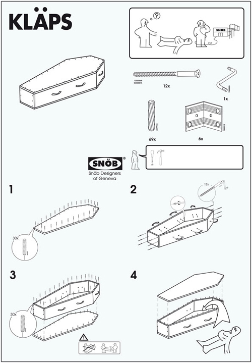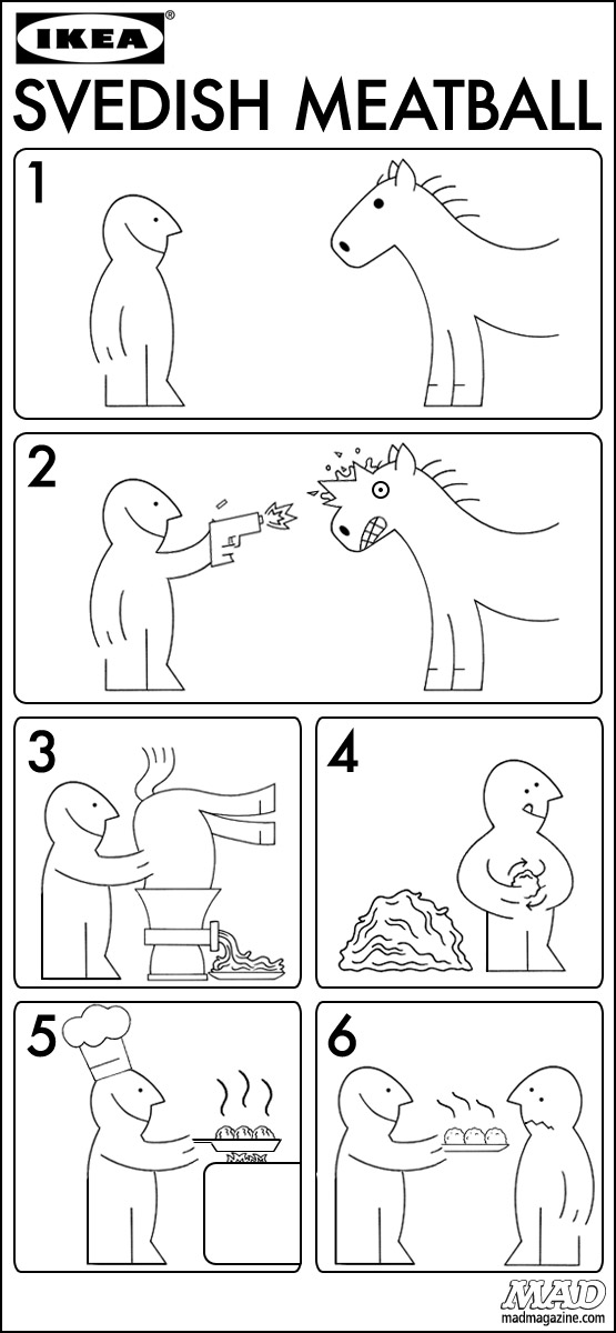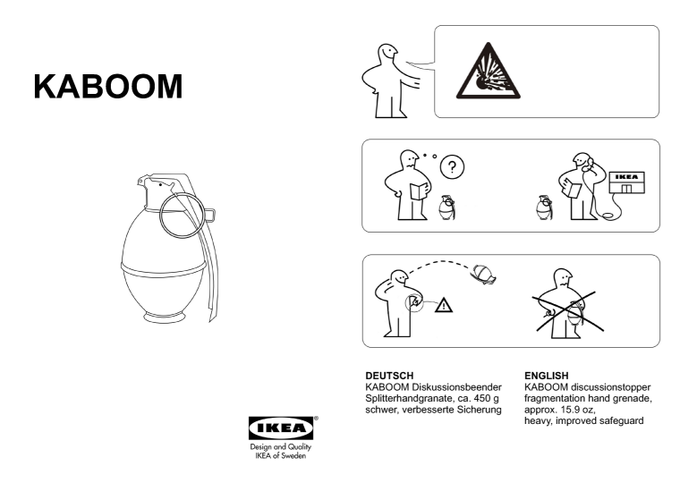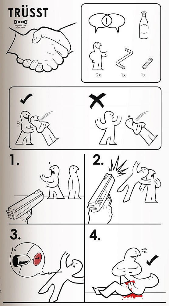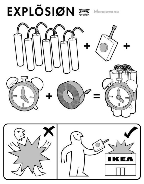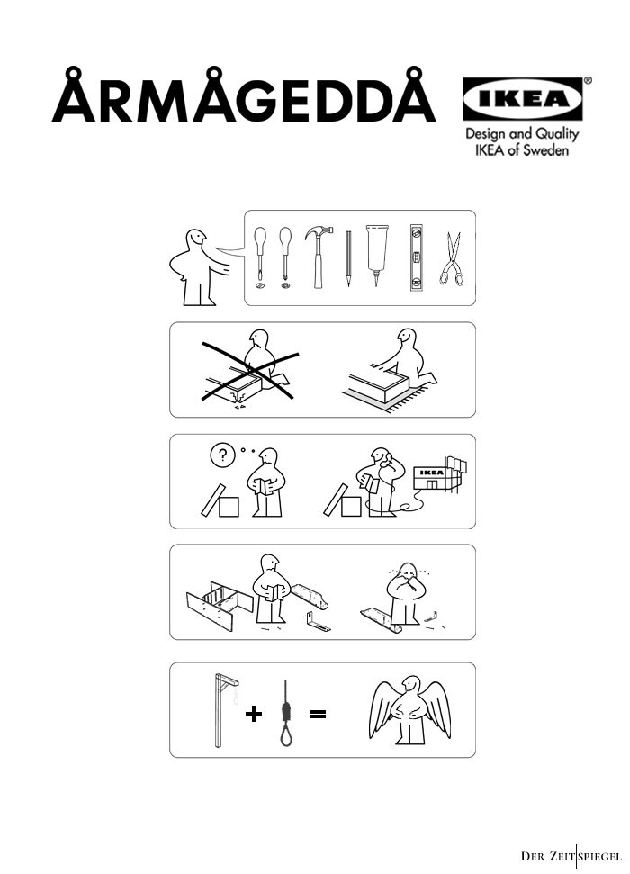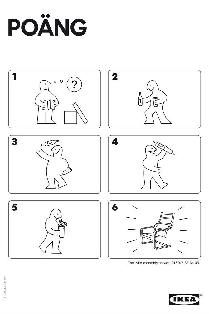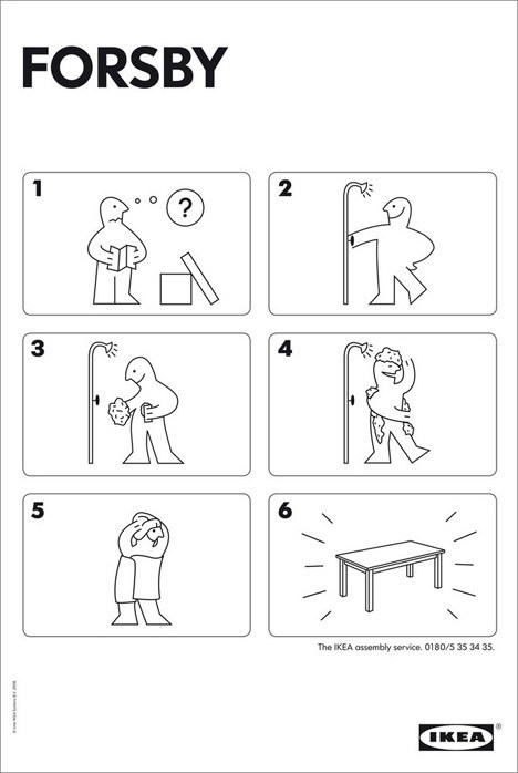 Einen großen Teil dieses Nicht-Erfolges manchen Aufbauversuchs kann die klassische IKEA-Aufbauanleitung für sich verbuchen, welche im allgemeinen vollkommen ohne Text auskommt. Wie viele Freundschaften mögen an diesen lustigen Comics schon zerbrochen, wie viele Ehen gescheitert sein? Man weiss es nicht.