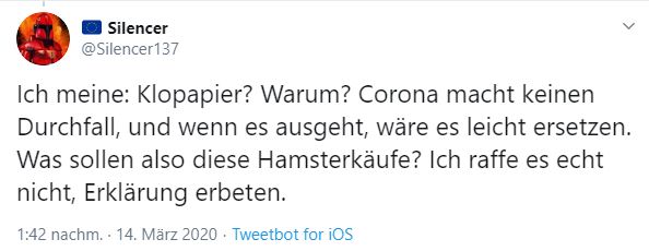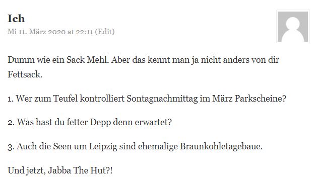 Das brachte mich auf die Idee auch einen Artikel mit irgendwas von wegen Corona und Klopapier zu schreiben, denn was diesem Blog noch fehlt sind viele, viele Leser die dann so tolle Kommentare hinterlassen können wie diesen hier unter meinem Artikel vom letzten Sonntag: