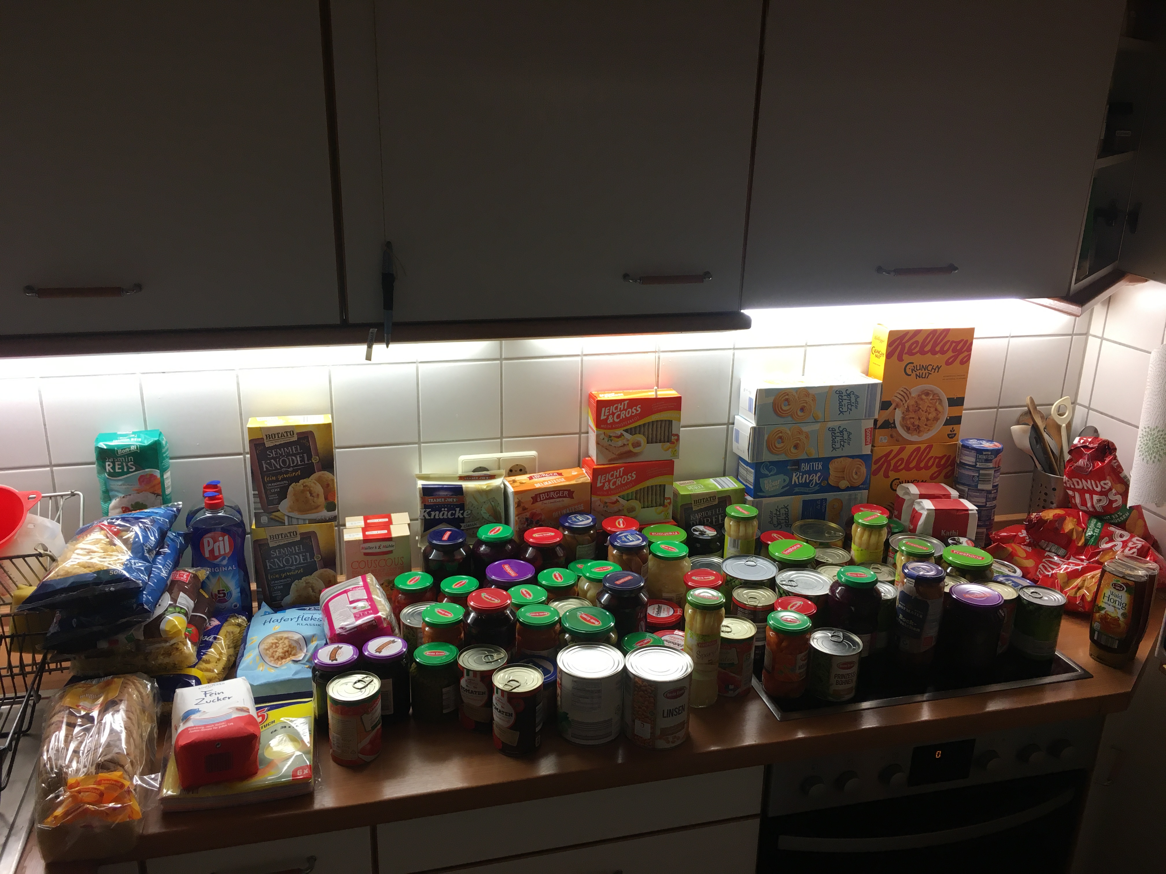 Jetzt habe Ich eine etwas grössere Aktion gestartet und meinen Konserven- und Trocken-Lebensmittel-Lager aufgefüllt. Für knapp 130 € gab es Klösse, Kartoffelbrei, Knäckebrot, Nudeln, Reis, Butterkekse (lange haltbar in der Aluverpackung) Cous Cous, Thunfisch, Erbsen, Karotten, Mais, rote Bohnen, grüne Bohnen, Linsen, Rotkohl, Kirschen, Pfirsische, Obstsalat, usw.