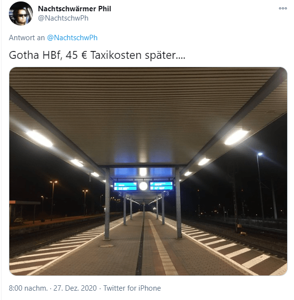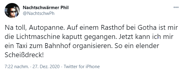 Ja, heute Morgen hab Ich dann gleich meine Versicherung angerufen (Tipp von Taxifahrer Nummer 1). Die meinten Ich habe da so einen Tarif bei dem so ein bundesweiter Abschleppservice drin ist o. ä. Ich könnte sogar die Zugfahrkarte einreichen, nur einen Leihwagen gäbe es nicht da Ich die Versicherung nicht vom Ort der Panne aus angerufen habe oder so. Keine Ahnung. Ist aber nicht so schlimm, Ich arbeite im Moment ja eh von zu Hause aus. Am 6.1. wird mein Auto dann bei Gotha abgeholt und in meine Werkstatt gebracht (so es denn bis dahin nicht geklaut oder aufgebrochen wurde – das würde mich bei meinem Glück nicht mehr wundern. Ist ja zumindest noch eine nagelneue Jacke und eine Kaffeemaschine drin. Und getragene Unterhosen, soll ja auch Leute geben die sowas brauchen können.).