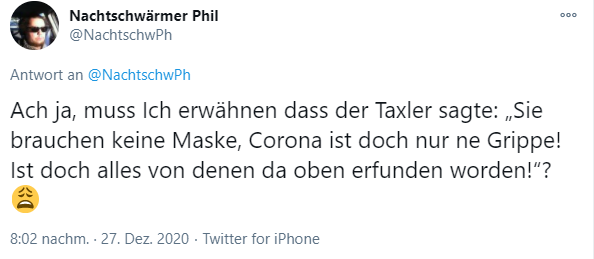 Kurze Zeit später kam das Taxi und lud mich ein. Ich hatte eine sehr “nette” Unterhaltung mit dem nicht-Maske-tragenden Taxler. Jetzt weiss Ich endlich dass das mit diesem Corona alles Fake von der Regierung Merkel ist, die die Wirtschaft in Deutschland kaputt machen will! Ja ha! Wusstet Ihr auch nicht, ne!