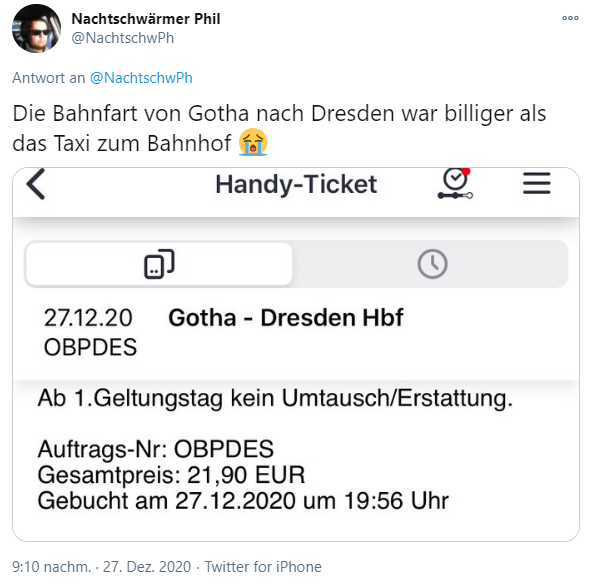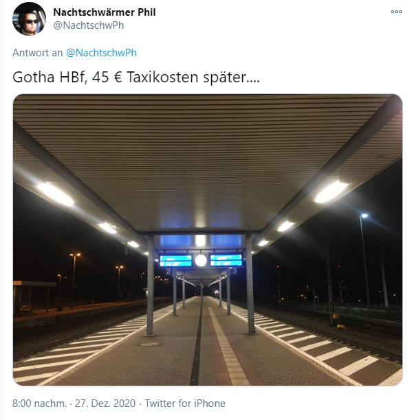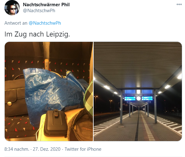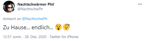 Gegen 0:30 also war Ich dann in Dresden. Ein weiterer “Sie brauchen keine Maske”-Taxifahrer fuhr mich nach Hause, wo Ich gegen 10 vor 1 ins Bett gefallen bin. Nach einem “Bin gut angekommen”-Telefonat mit Mama schlief Ich ein…..