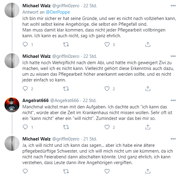Ich meine, damit hier kein Missverständnis aufkommt: Ich verstehe mich mit meiner Mutter sehr gut, aber Ich glaube, vom heutigen Stand her betrachtet, pflegen könnte und wollte Ich Sie nicht. Erstens ist es, zumindest im Moment, so, dass Ich mein eigenes Leben gerade nicht auf die Reihe bekomme. Ich wandle hier mit meiner Home-Office-Depression durch die Gegend und bemitleide mich selbst. Auch meinen Haushalt bekomme Ich im Moment nicht in Schuss. Ich glaube kaum, dass Ich da auch noch die Pflege eines Angehörigen auf die Reihe bekommen würde.