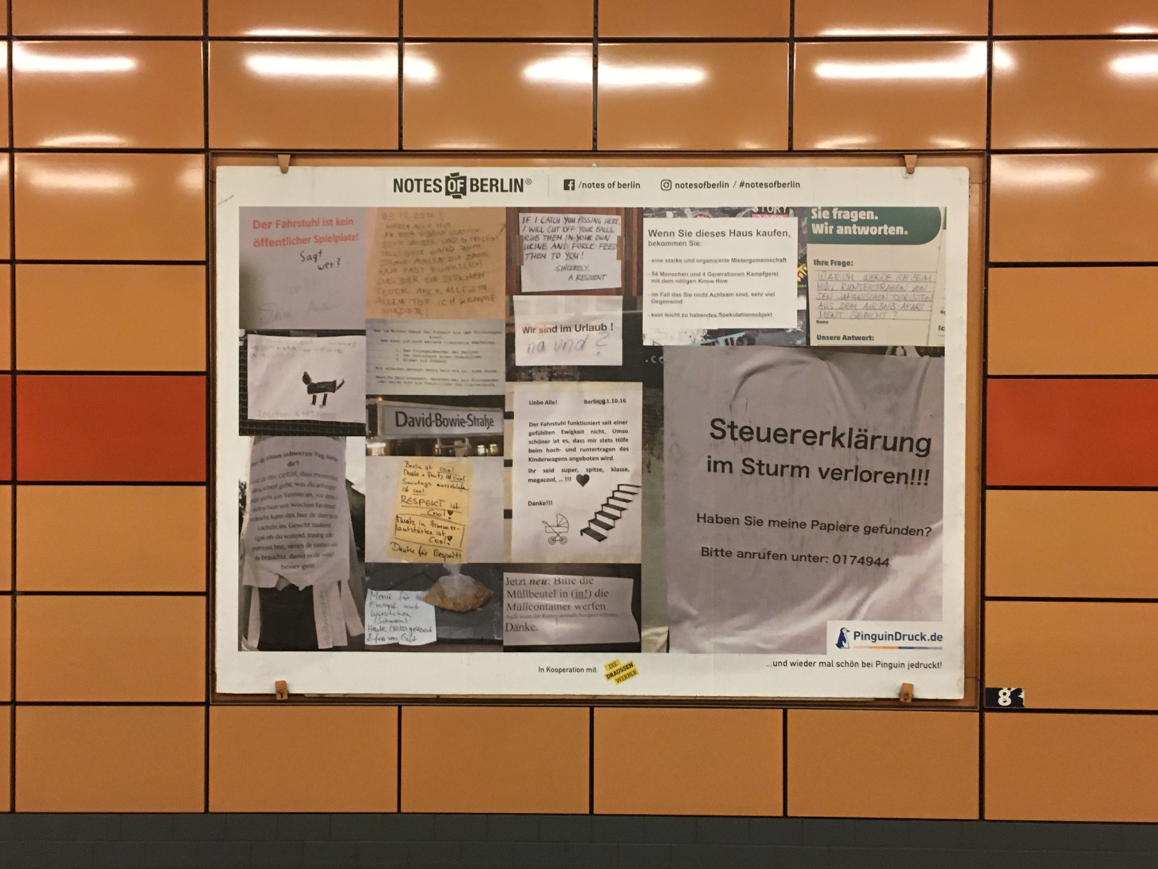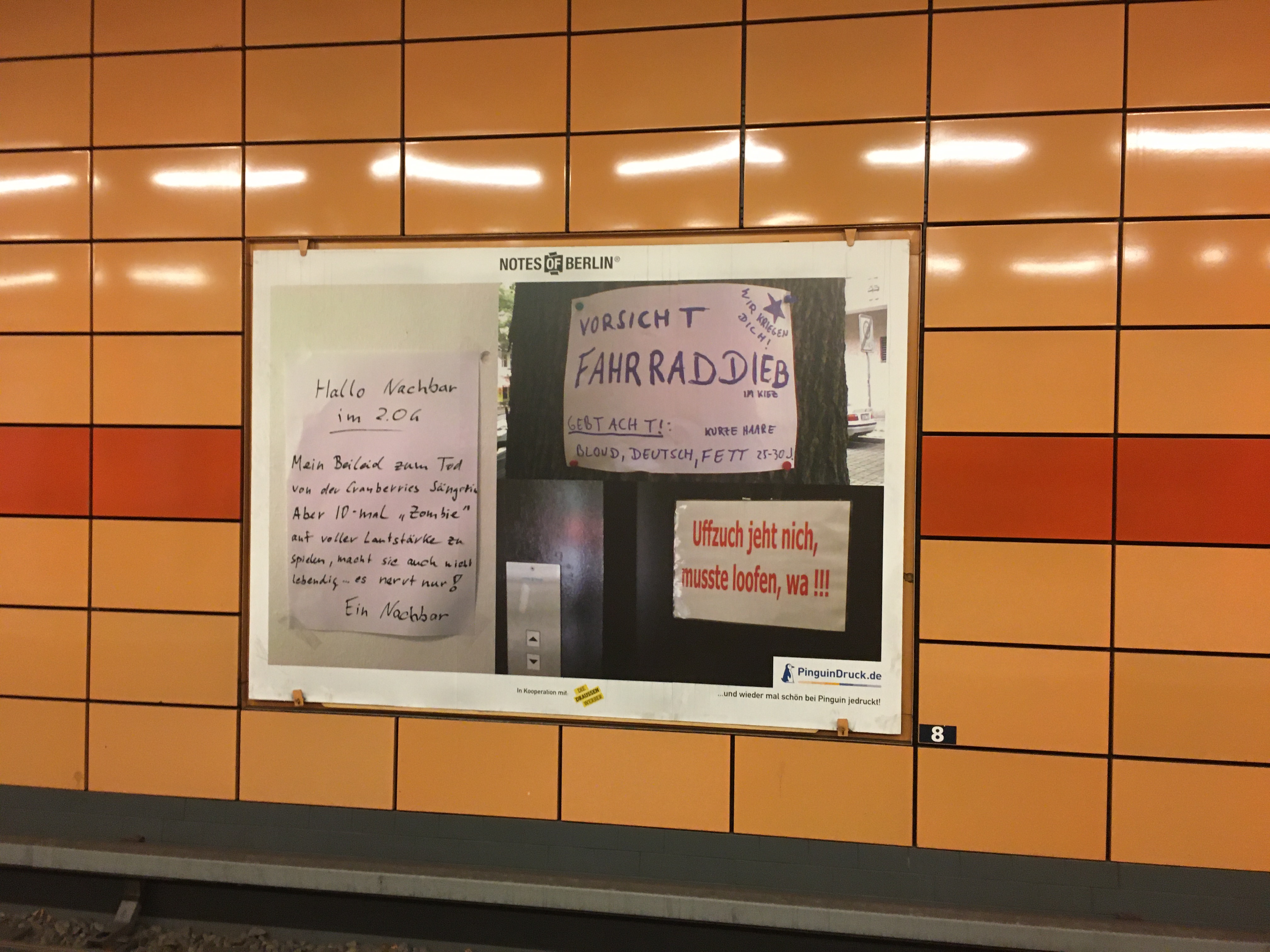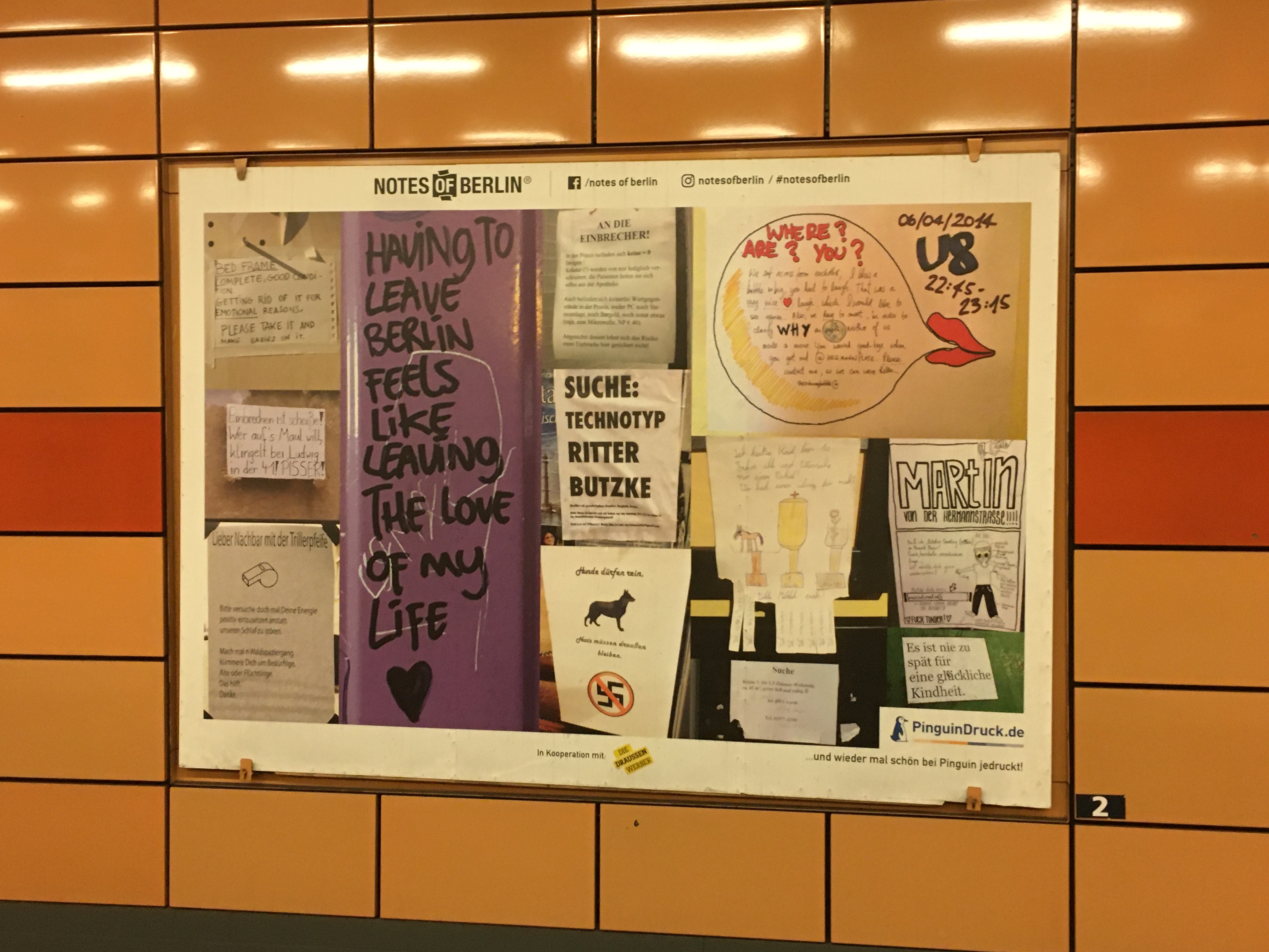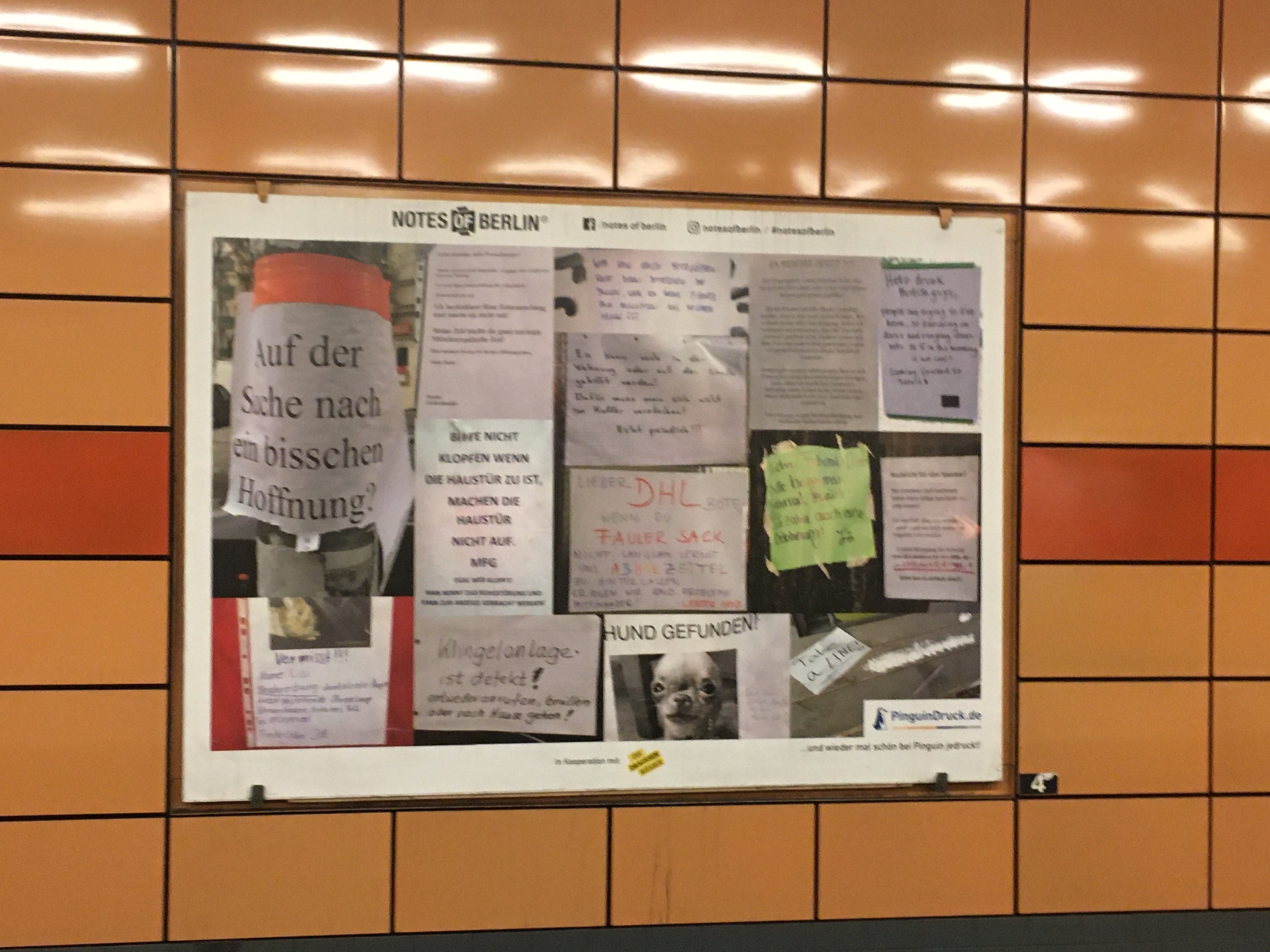 Ich folge je schon seit Jahren dem Blog Notes of Berlin der lauter kuriose Zettel die überall so in der Hauptstadt hängen (das ist wirklich so: Jeder Laternenpfahl und jede Ampel ist zugeklebt mit “suche, gefunden und entlaufen”). In den U-Bahnhof gab es nun eine kleine Ausstellung gesammelter Werke auf den Plakatwänden.