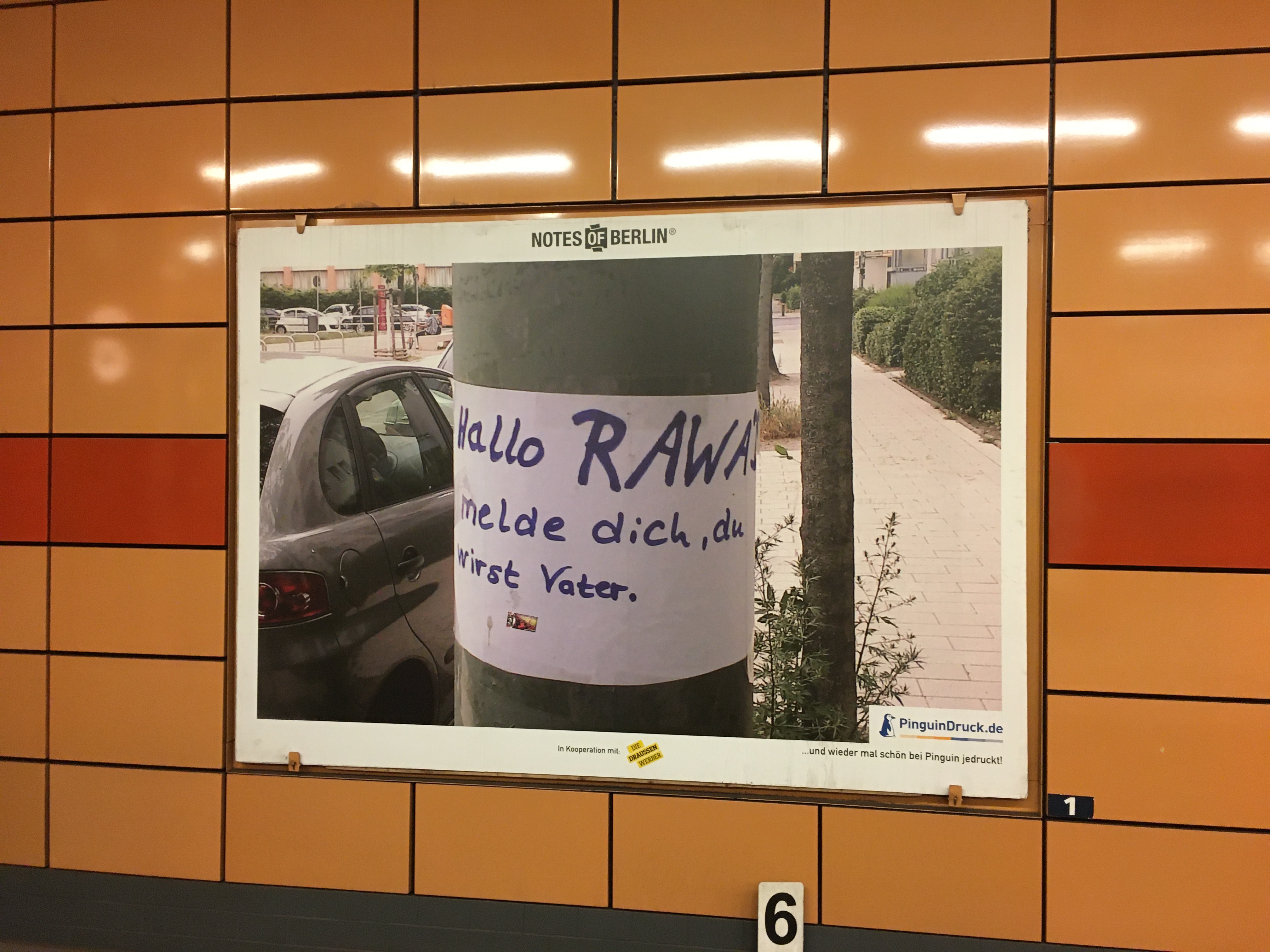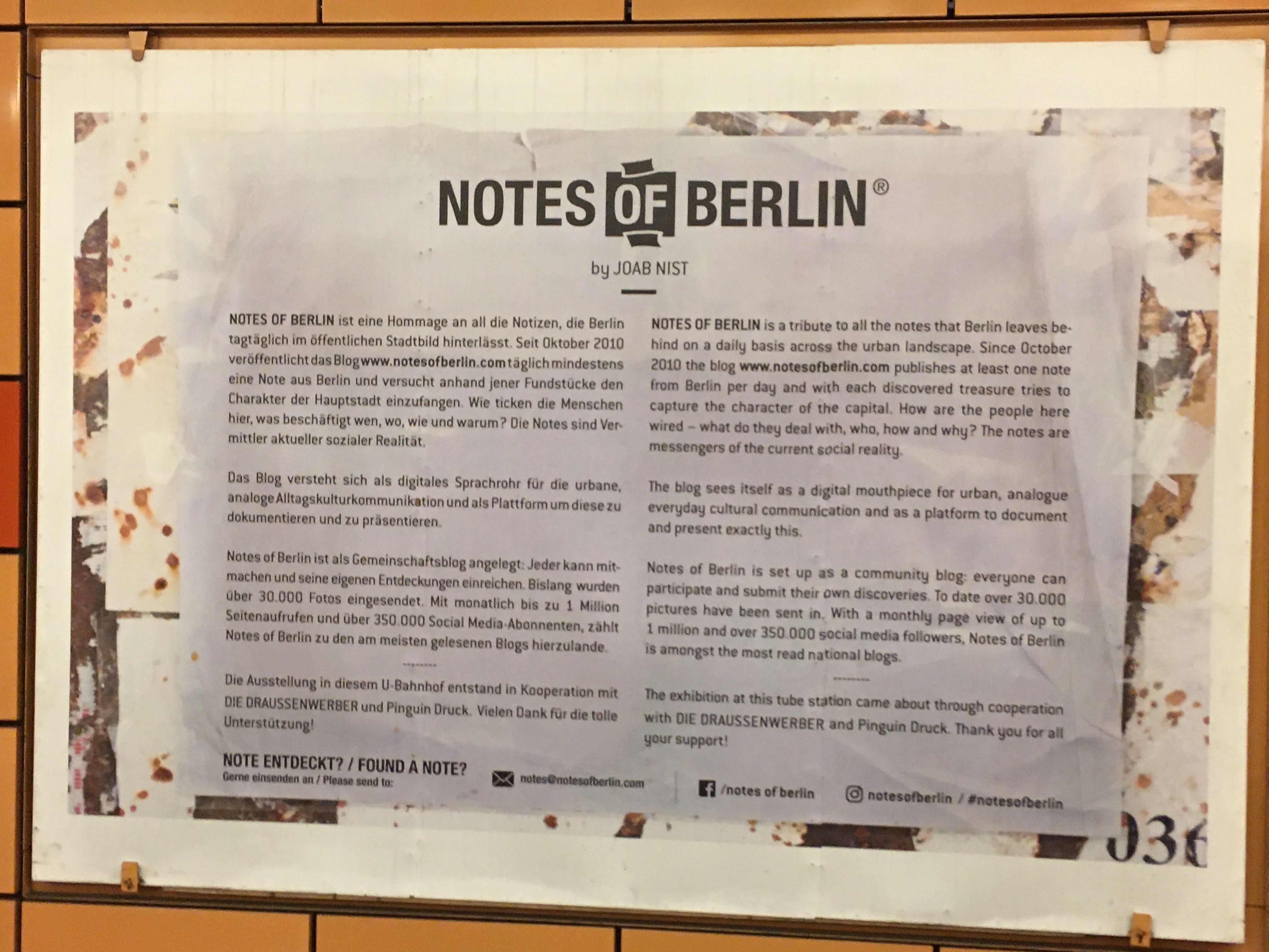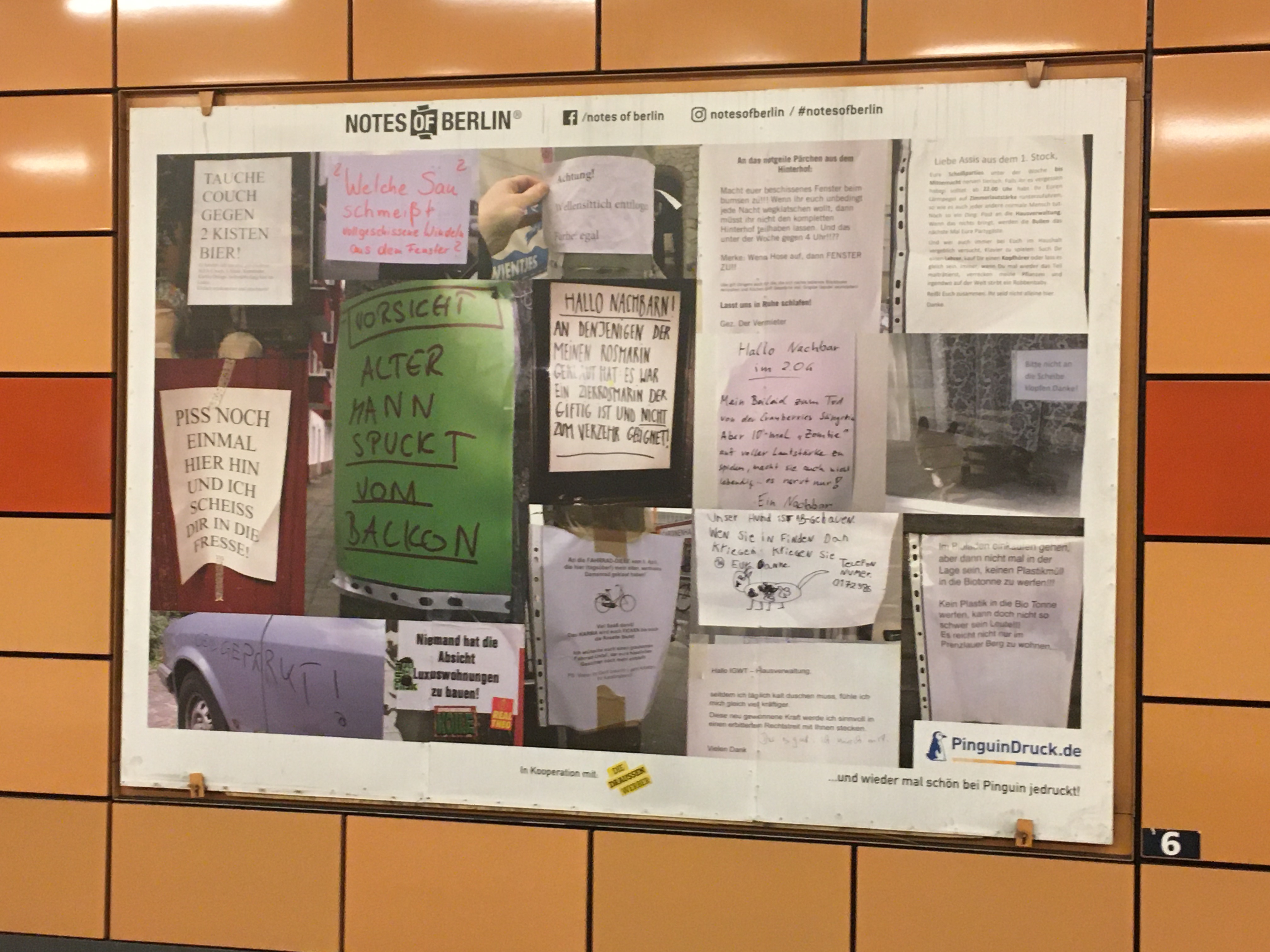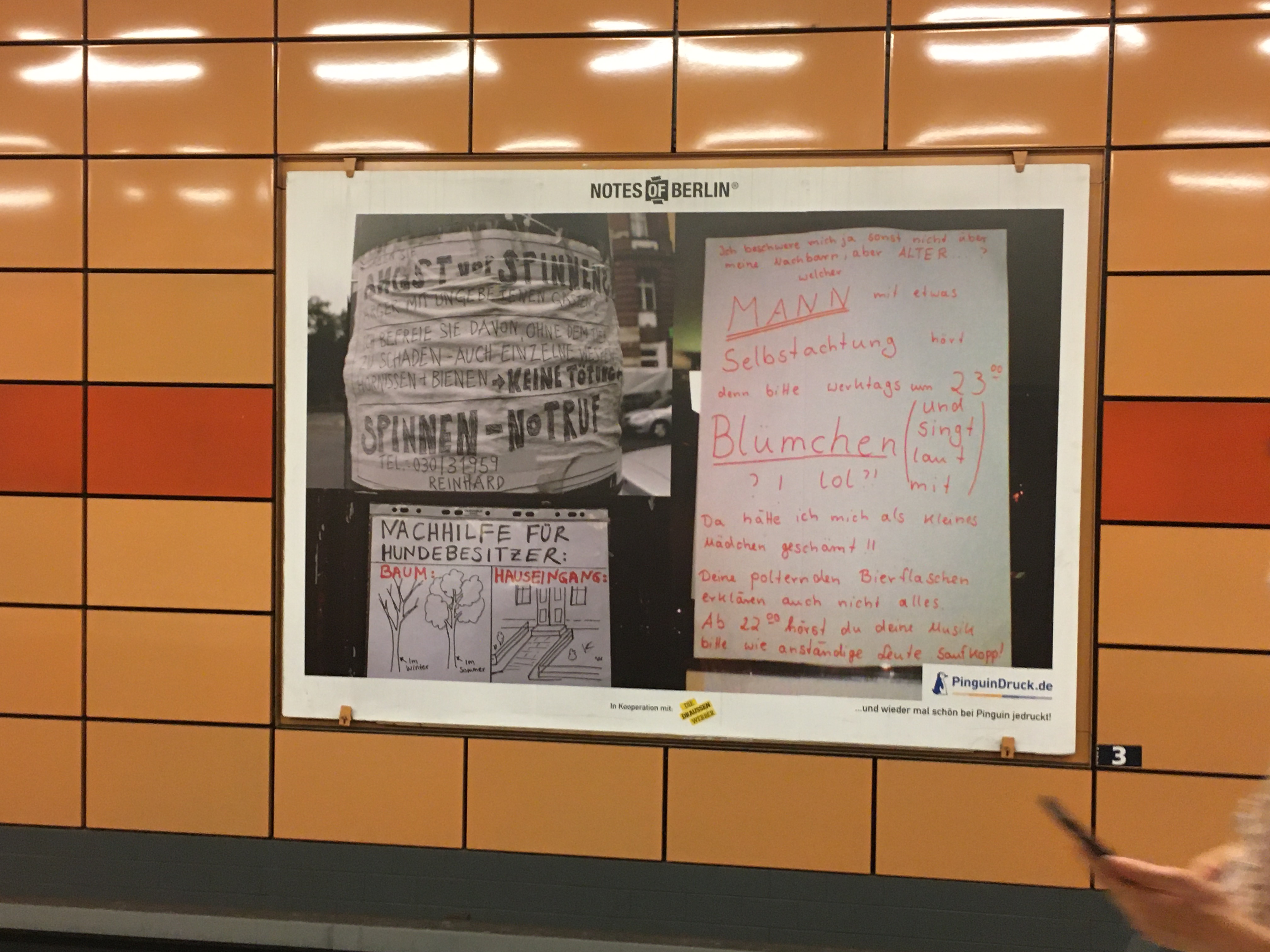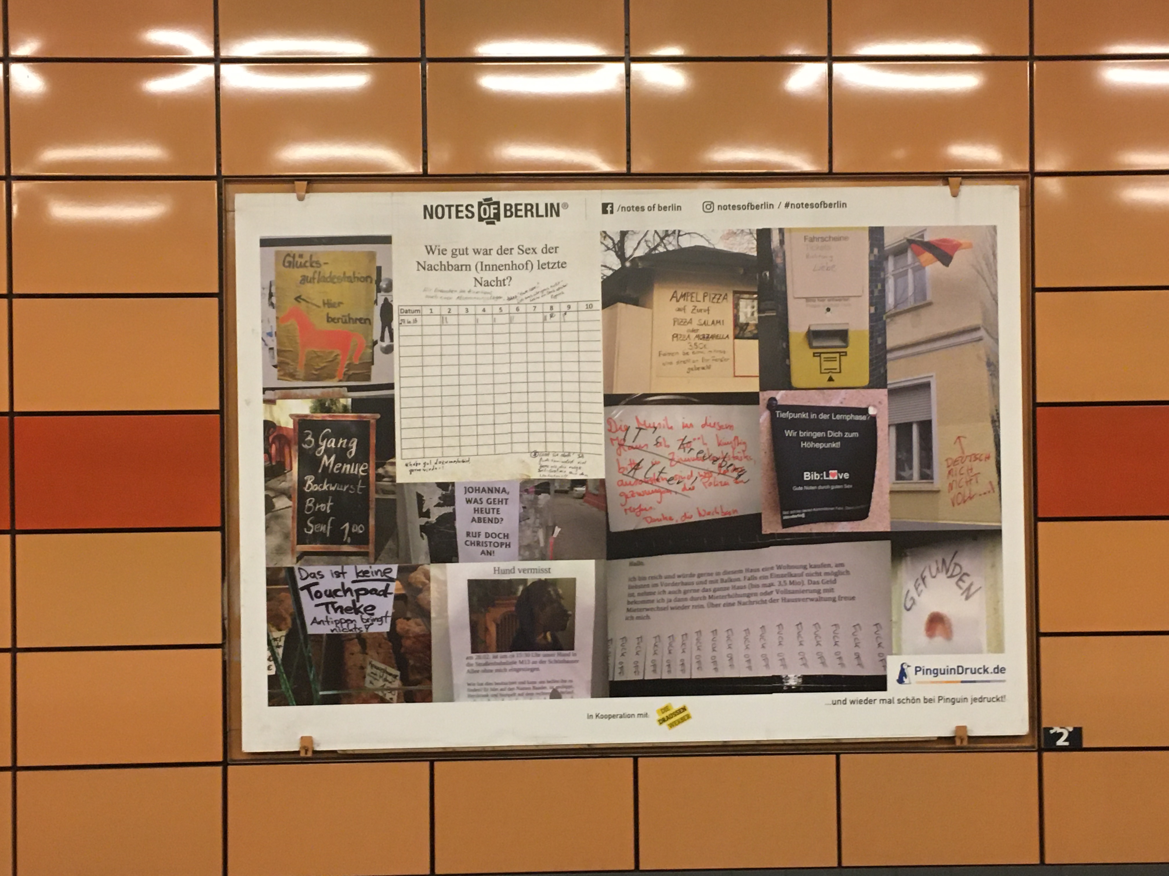 Ich folge je schon seit Jahren dem Blog Notes of Berlin der lauter kuriose Zettel die überall so in der Hauptstadt hängen (das ist wirklich so: Jeder Laternenpfahl und jede Ampel ist zugeklebt mit “suche, gefunden und entlaufen”). In den U-Bahnhof gab es nun eine kleine Ausstellung gesammelter Werke auf den Plakatwänden.