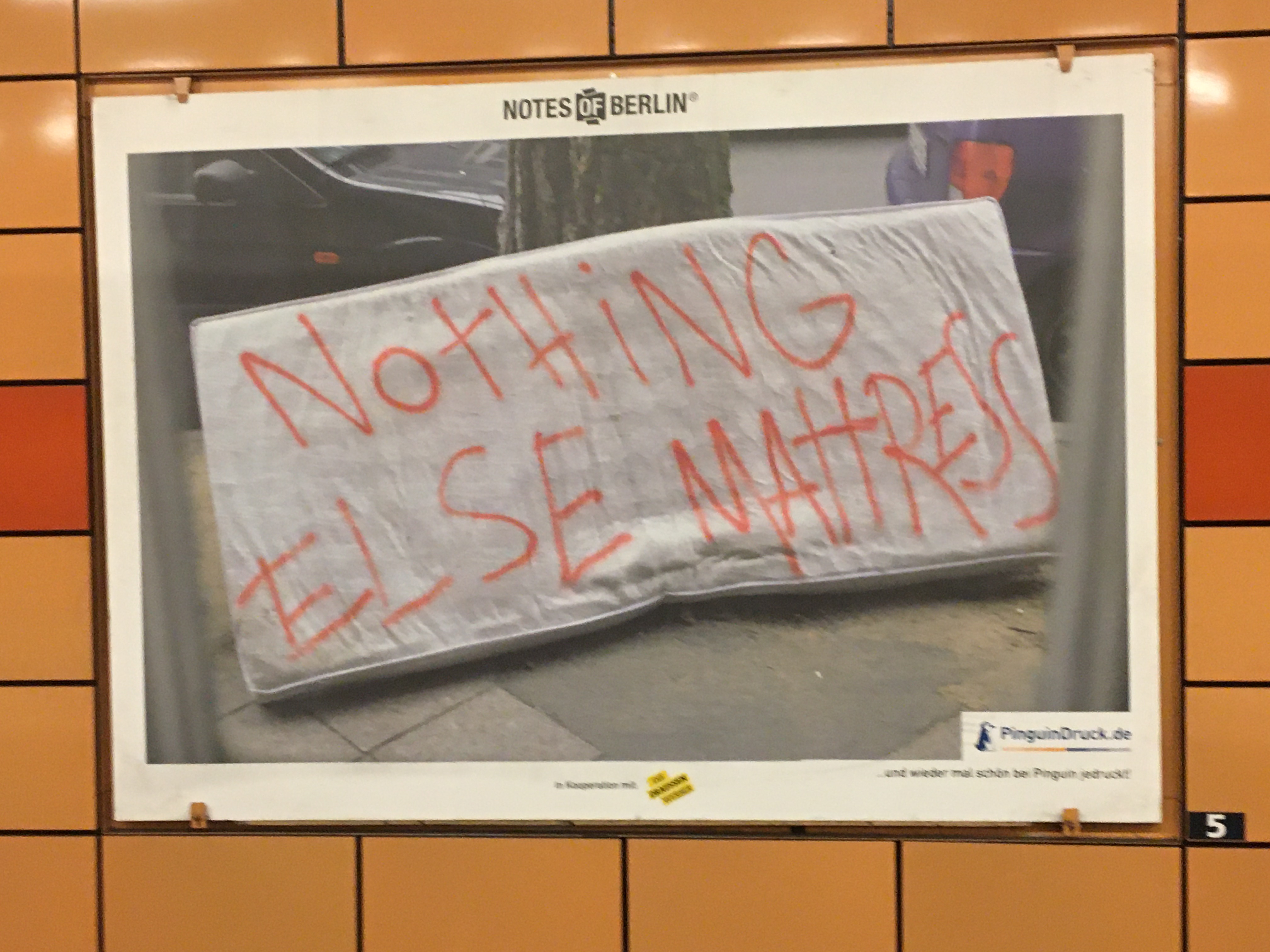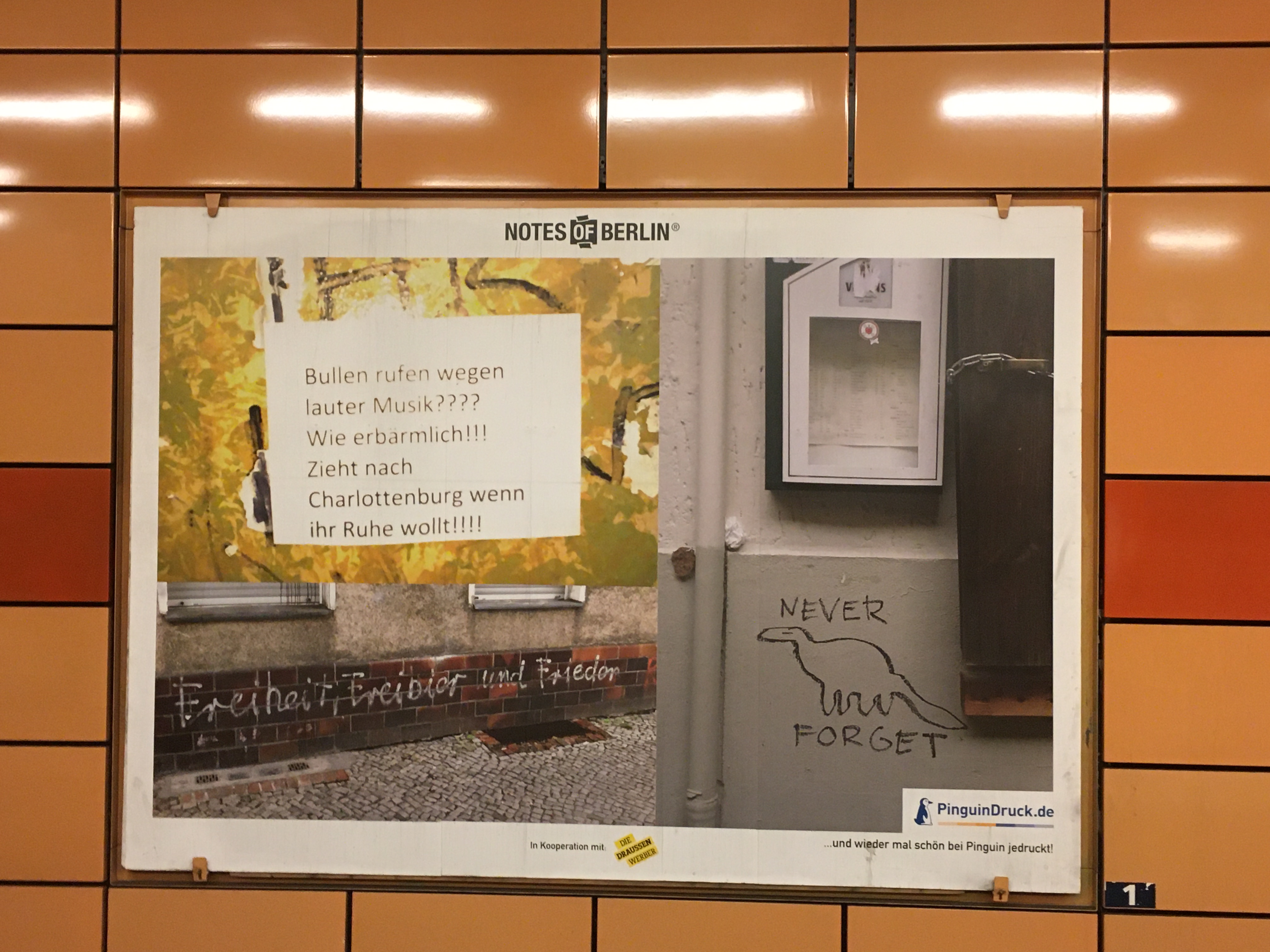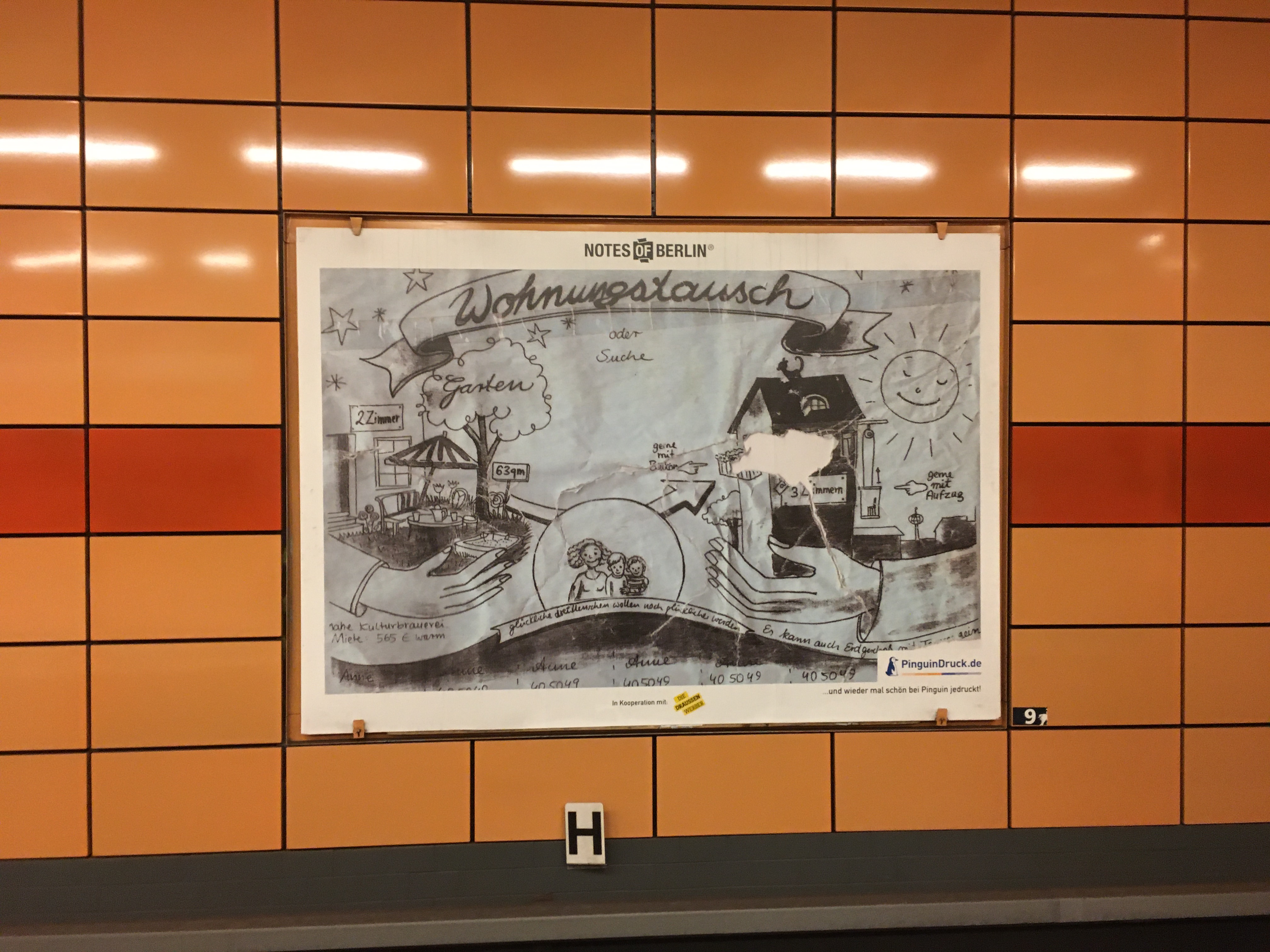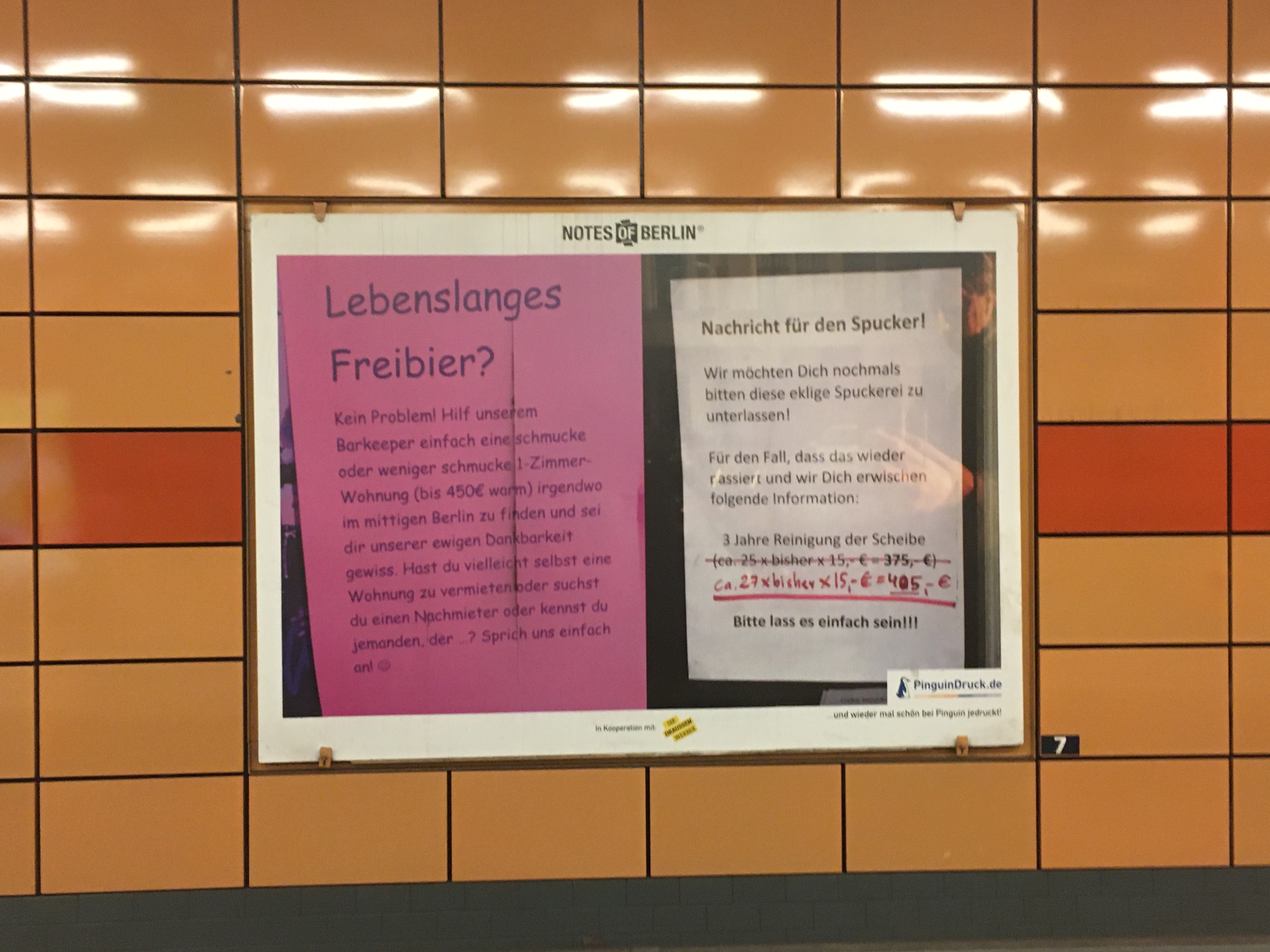 Ich folge je schon seit Jahren dem Blog Notes of Berlin der lauter kuriose Zettel die überall so in der Hauptstadt hängen (das ist wirklich so: Jeder Laternenpfahl und jede Ampel ist zugeklebt mit “suche, gefunden und entlaufen”). In den U-Bahnhof gab es nun eine kleine Ausstellung gesammelter Werke auf den Plakatwänden.