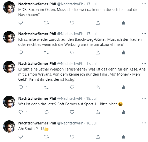 Ach du meine Güte! Ich wurde wieder einmal darin bestärkt dass es vollkommen in Ordnung ist keine Glotze zu haben! Entweder laufen Nachrichten die mich nicht interessieren oder es kommen dämliche Shows für die schneklklopfenden Grosseltern (Verstehen Sie Spass? – NEIN! ICH VERSTEHE KEINEN SPASS! DIESE SENDUNG IST PSYCHISCHE FOLTER!!!!!!) oder Ami-Serien oder dämliches Reality TV oder Sendungen für “echte Männer” auf DMAX. Au weia…..