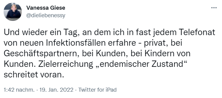 Diese kognitive Dissonanz wird für mich immer schwerer auszuhalten. Diese Differenz zwischen ja, Ich weiss das Corona gefährlich und tödlich sein kann, dass das was die da in den Nachrichten sagen keine Märchen sind und hey, irgendwie hat das mit dem Corona null komma gar keine Auswirkung auf meinen Alltag, Ich kenne ausser einem keinen der Corona hat oder hatte, Ich kenne keinen Intensivpfleger, usw.