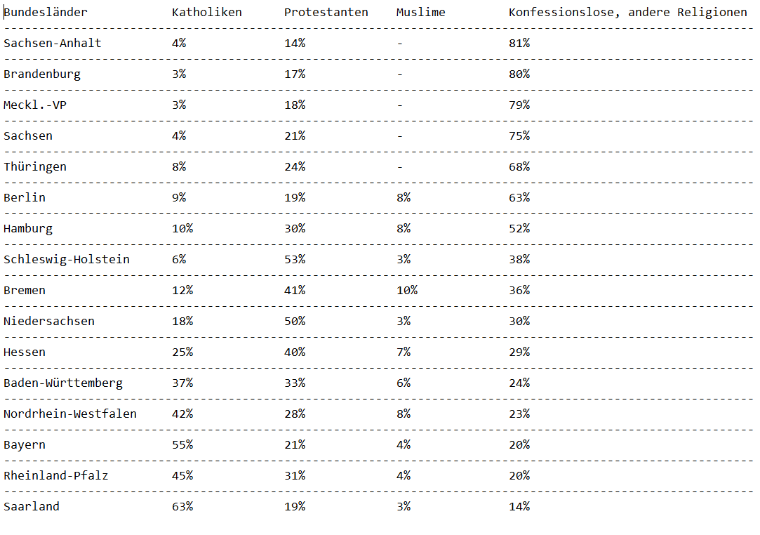 Auch das passt ins Bild hier in Sachsen: Wir haben hier das Bundesland mit einer der niedrigsten konfessionsrate. Vor Sachsen liegen nur noch Mecklenburg-Vorpommern, Brandenburg und Sachsen Anhalt, ein Platz hinter uns Thüringen. Und das, wo Sachsen mit Wittenberg und Sachsen-Anhalt mit Eisleben sogar zwei namentliche “Lutherstädte” hier im Osten hat.