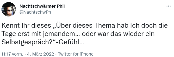 Ja, mir ist in den letzten Monaten, vor allem seit Ich coronabedingt im Homeoffice bin, immer öfter aufgefallen, dass Ich, meistens online, über ein Thema stolpere und mir dann denke: Da hast du doch die Tage mit jemandem darüber gesprochen. Wenn Ich dann aber rekapituliere, mit wem Ich in letzter Zeit, mündlich oder fernmündlich, Kontakt hatte, ist da meistens keiner dabei bei dem das passen könnte.