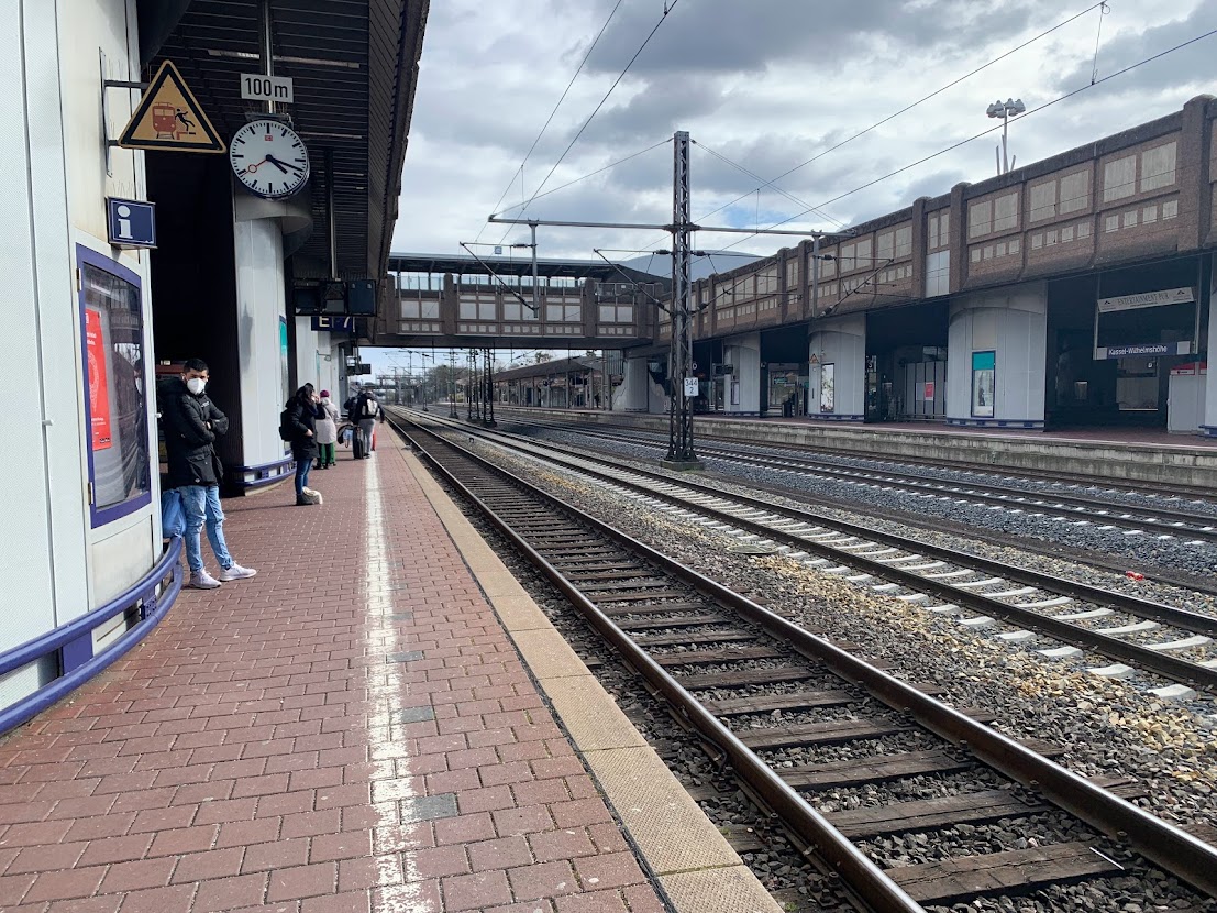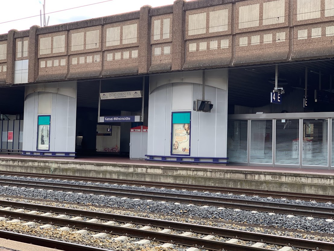 …bis 15:54 Uhr nach Kassel-Wilhelmshöhe. Mann ist das ein hässlicher Bahnhof, also zumindest unten auf den Bahnsteigen. Und blöd geplant: Die “Laufgänge” hinter den Bahnsteigen sind hinter fetten Pfeilern die das Oberdeck tragen und die Bahnsteig-Anzeiger waren anscheinend zu breit um Sie direkt vorne am Gleis anzubringen. So schraubte man sie hinter den dicken Säulen an, wo man sie von der Bahnsteigkante nicht sehen kann. Da hat der Architekt wohl das falsche Zeug geraucht. Ausserdem gibt es da keine Aufzüge und die Rampe die man nehmen kann hab Ich erst gefunden als Ich am Zielbahnsteig war. Toll. Ich liebe Treppensteigen!