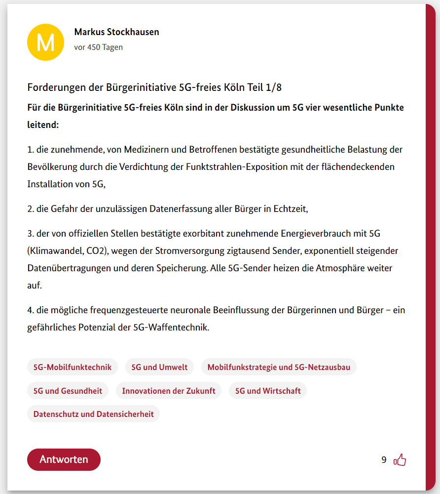 Heute geht es um die Beiträge einer Bürgerinitiative die ein 5G freies Köln will sowie um Verschwörungstheorien zu 5G.