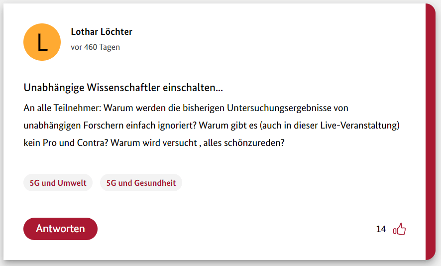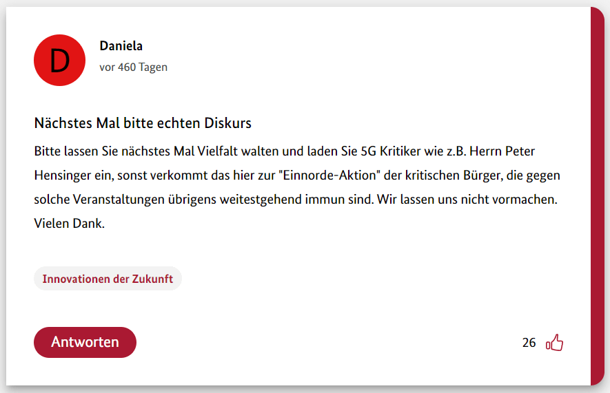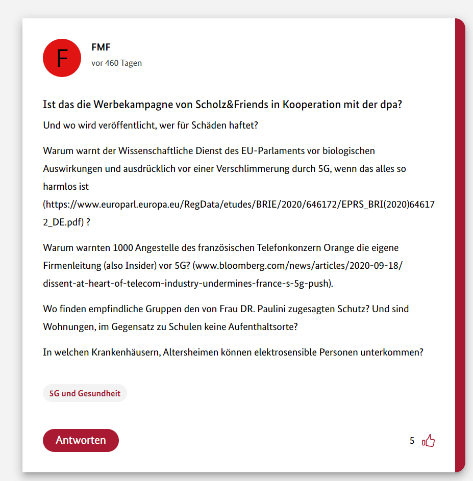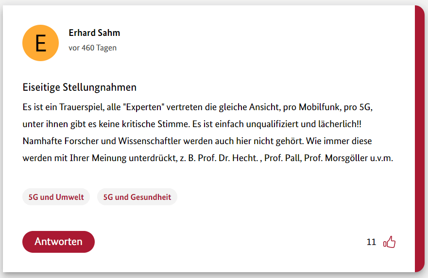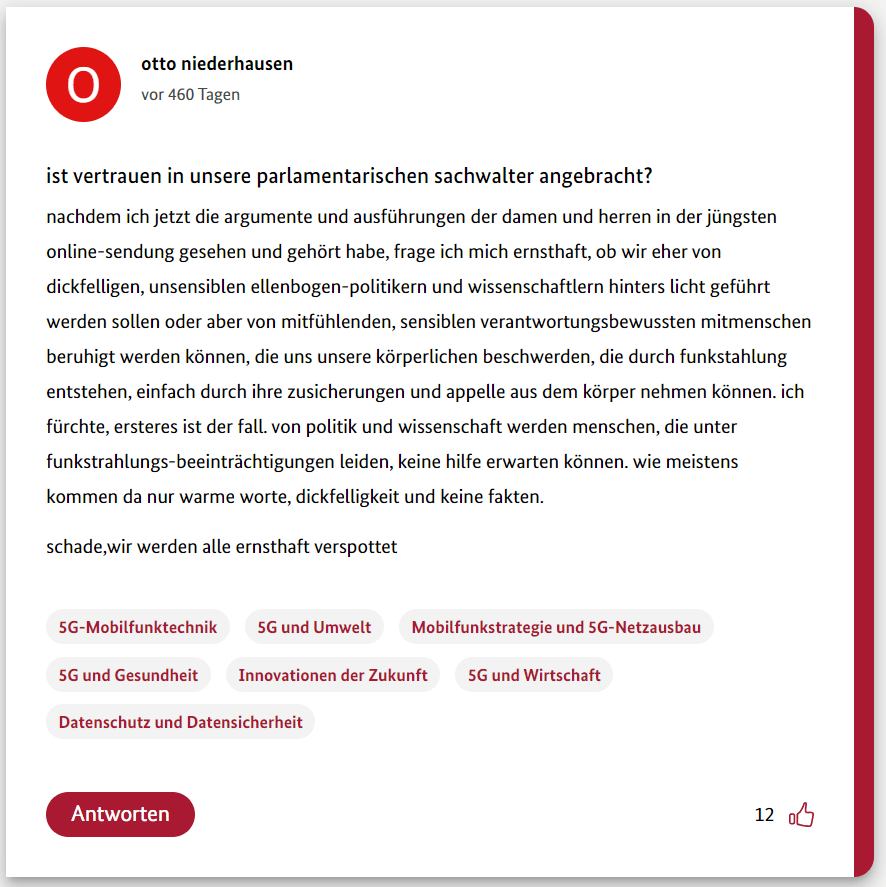Hier also der neunte Teil meiner 12-teiligen Reihe über die Schwurbler im 5G-Forum der Bundesregierung.