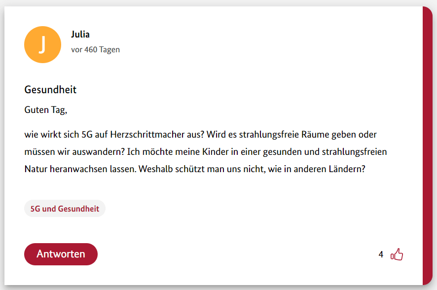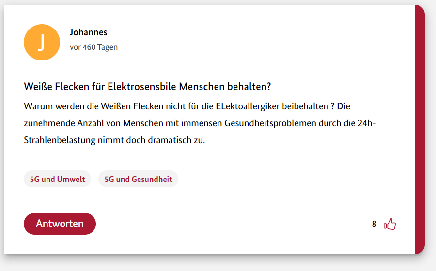 Wer glaubt dass es sowas wie Elektrosmog und Elektrosensibilität gibt der kommt auch auf solche Ideen: 5G freie Zonen mit kleinen Siedlungen für Leute die sich der Strahlung nicht aussetzen wollen! Oh Mann! Ich hätte da eine Idee: Da im Osten in Brandenburg, da bei den ganzen Nazis, da will eh keiner wohnen. Da machen wir einfach 5G freie oder noch besser telekommunikationsfreie Kolonien auf, dann können diese Leute auch unser Internet nicht mehr mit solchem Bullshit fluten…
