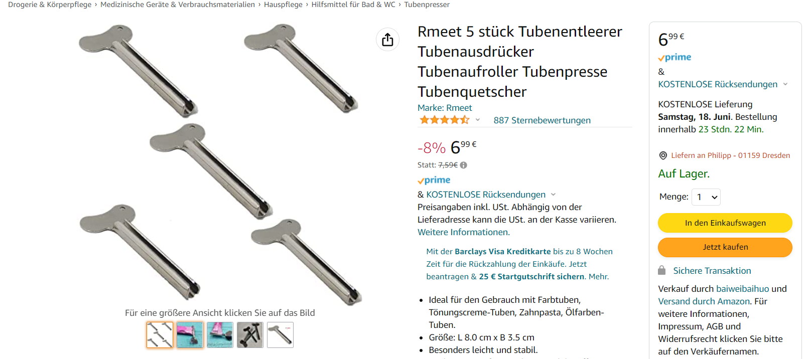 Das sind also so kleine „Schlüssel“ die man hinten auf die Tube aufschiebt um sie dann zu drehen, so dass man auch wirklich den allerletzten Rest Tomatenmark, Senf, Zahnpasta oder was auch immer rausbekommt. Was für Sparfüchse also!