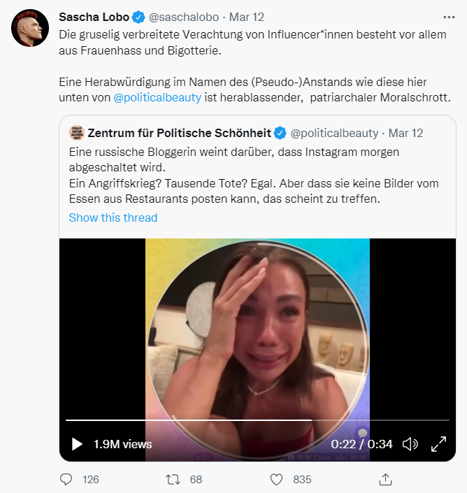 Das Zentrum für politische Schönheit ätzte hier nun gegen die gezeigte Person im Tonus a la “hier sterben Menschen im Krieg und da weint jemand weil er keine Essensbilder mehr posten kann”.