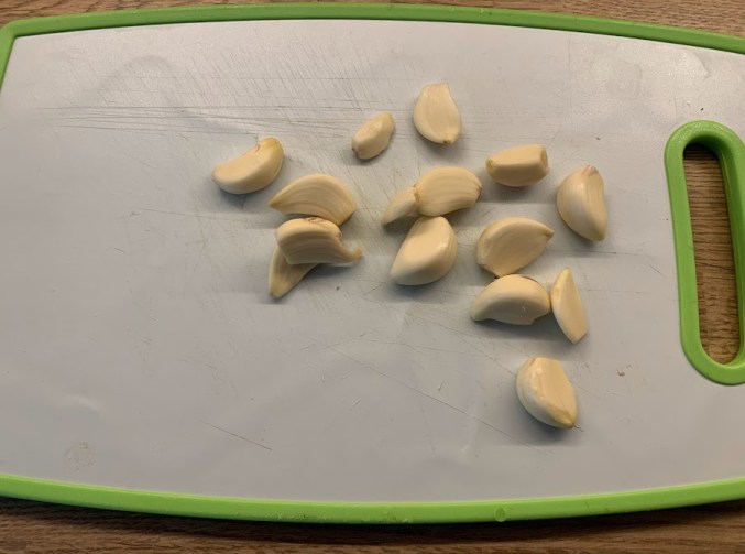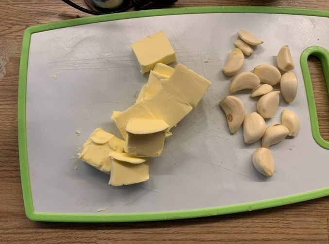 Dazu habe Ich Knoblauch geschält, Butter klein geschnitten, …