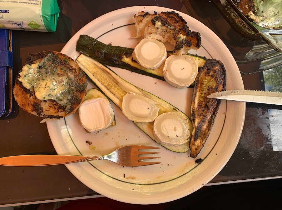 … und als diese heiss waren ging es mit der Vorspeise los: Gegrillte Zucchinischeiben mit Ziegenkäse. Hmmmm, lecker!