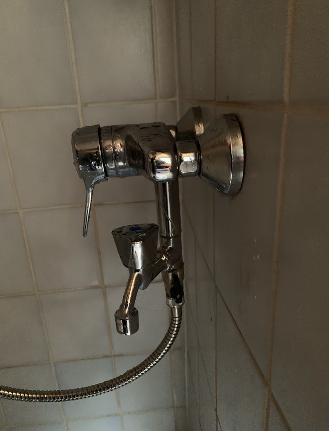 In der Dusche des Bades ist eine Mischbatterie angebracht, die nur einen Anschluss für einen Duschschlauch hat, keinen zweiten Auslauf, wie man Ihn an einer Armatur für z. B. eine Badewanne hat. Das wäre auch keine gute Idee, denn die Dusche ist auch schon so recht eng, so dass Ich mit meinen 170 KG gerade so hinein passe.