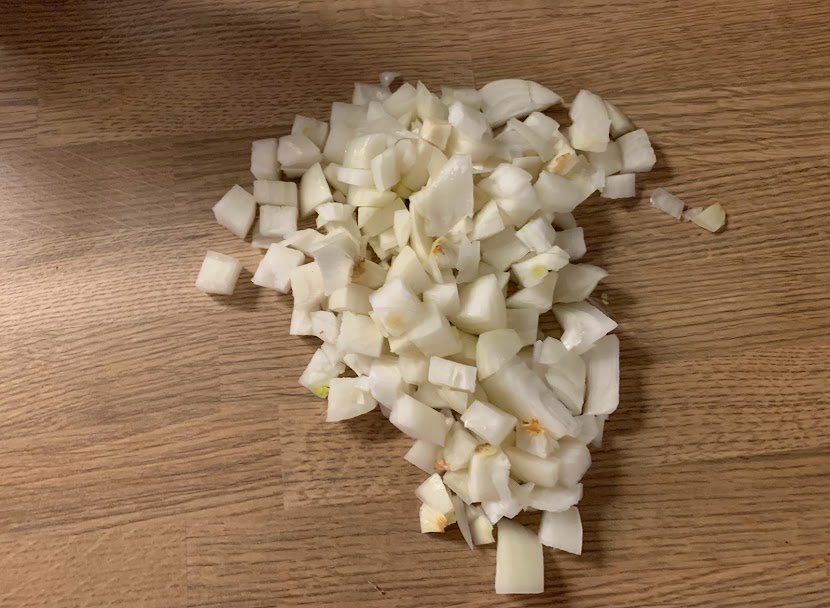 Zuerst die Zwiebeln schälen und in grobe Würfel schneiden.