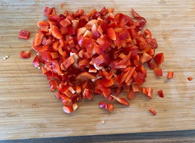 Danach würfeln wir die Paprika auf Erbsen-und-Mais-Größe.
