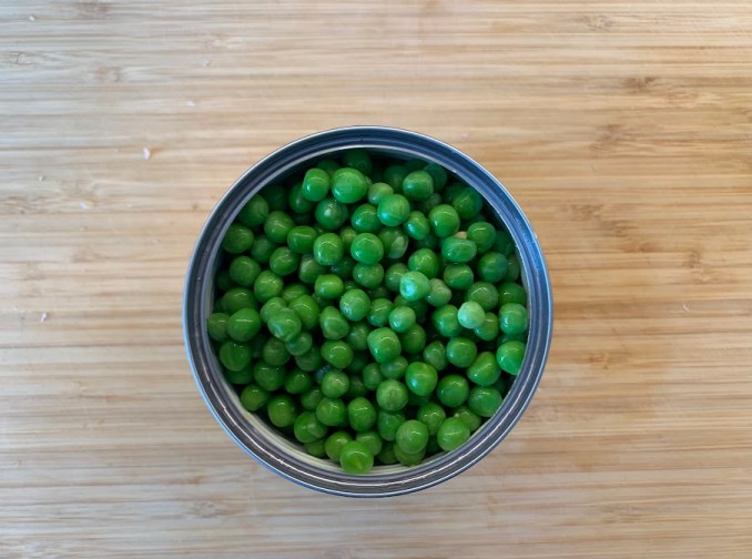 Anschliessend schütten wir entweder die Dosenerbsen ab oder (das ist eher meine Wahl, da das besser schmeckt) wir füllen die leere Maisdose mit Tiefkühlerbsen, tauen die unter fliessend heissem Wasser auf und schrecken sie ab.