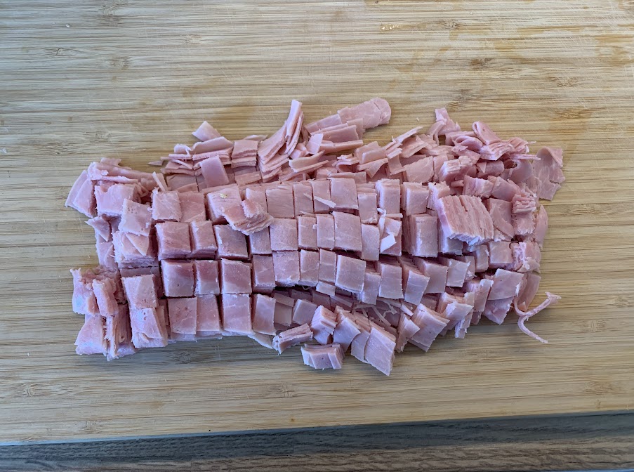 Danach würfeln wir die Paprika auf Erbsen-und-Mais-Größe.