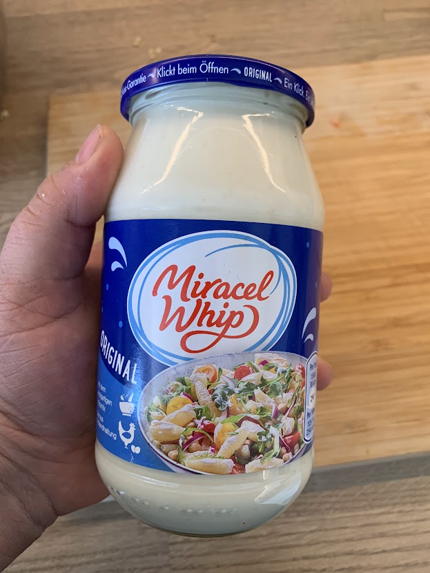 - 1 grosses Glas Miracel Whip (VOLLFETT! (dunkelblaues Etikett. Wir wollen ja nicht abnehmen!)