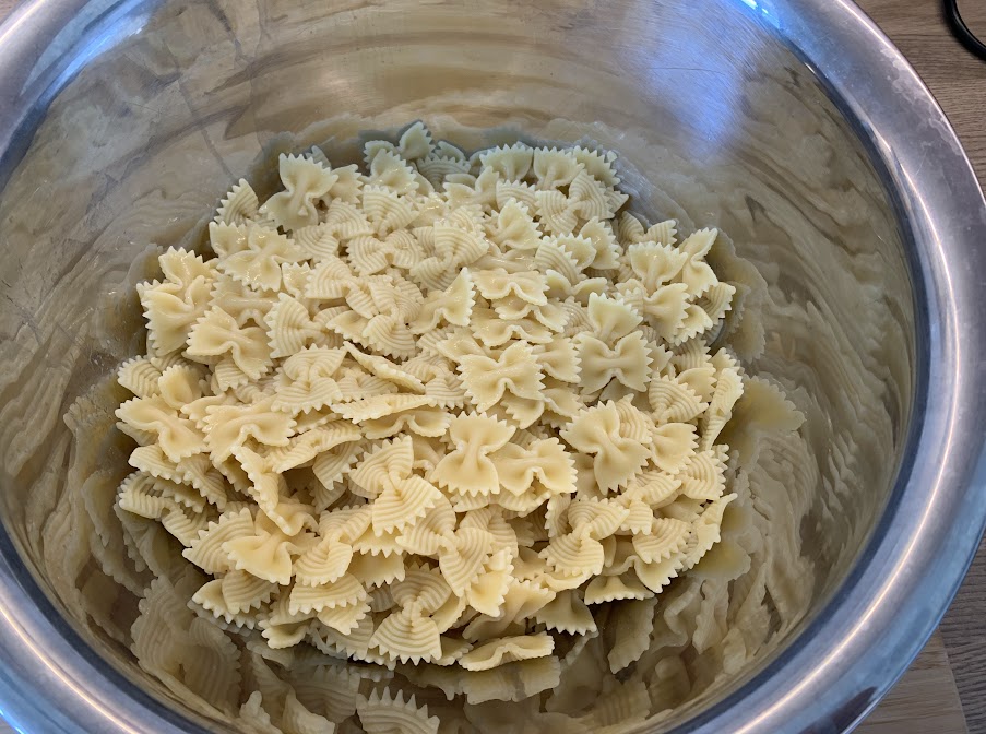 Sodann geben wir all das zu den Nudeln in eine große Schüssel …