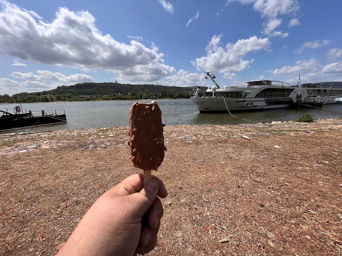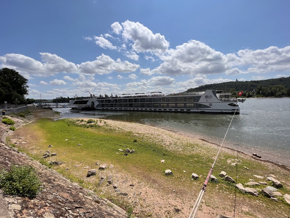 Ich schmauchte in Ruhe ein Pfeifchen, holte mir ein Eis und beobachtete ein Flusskreuzfahrtschiff beim Anlegen und Wasserholen. Die “George Elliot”.