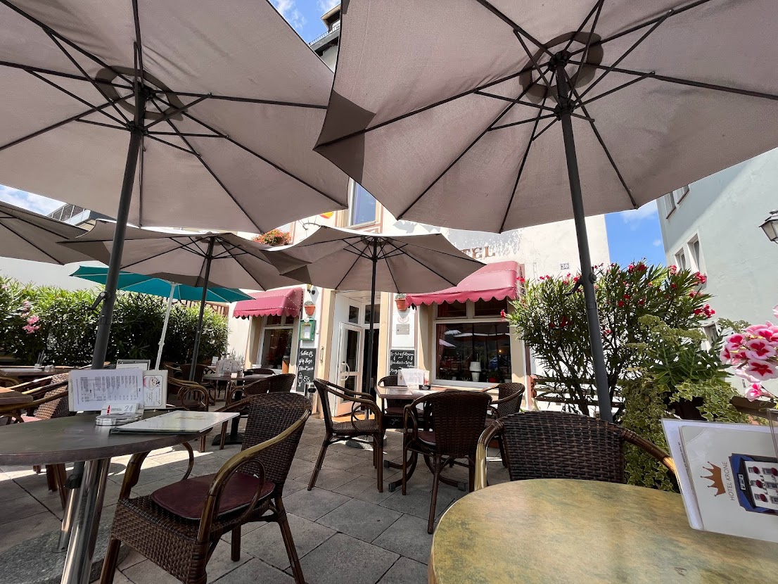 Danach schlenderte Ich weiter Stromaufwärts an der Promenade entlang. Ich schaute interessehalber in den einen oder anderen Touri-Nepp-Laden rein, und kehrte schliesslich für 30 € zu einem Fritteusenschnitzel mit Jägersauce und Pommes sowie “Eimersalat” und zwei Apfelschorlen ein. Klingt schlimmer als es war.