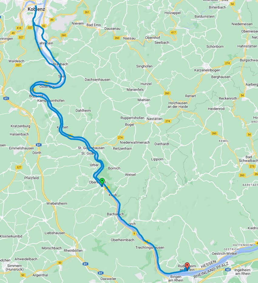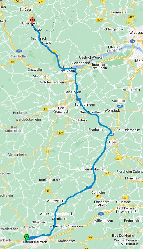 Um 15:40 Uhr verliess Ich Rüdesheim wieder und fuhr die B42 wieder hoch nach Koblenz. Dann wieder über den Rhein rüber, wieder runter nach Bingen und dann via Landstrasse zurück nach Kaiserslautern.