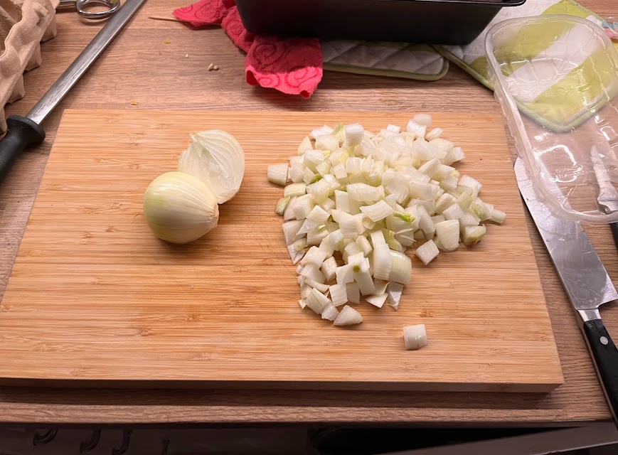 Den Speck und die Zwiebel in ca. 1 cm große Würfel schneiden und zusammen mit reichlich Olivenöl und dem gehackten Knoblauch in der Pfanne anbraten.