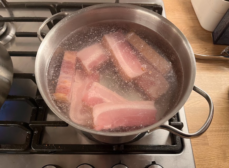 Die Speckscheiben halbieren, mit reichlich Wasser in einen Topf geben und ca. 1 – 1,5 Stunden kochen.
