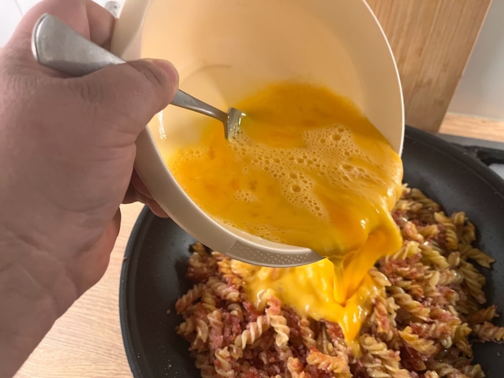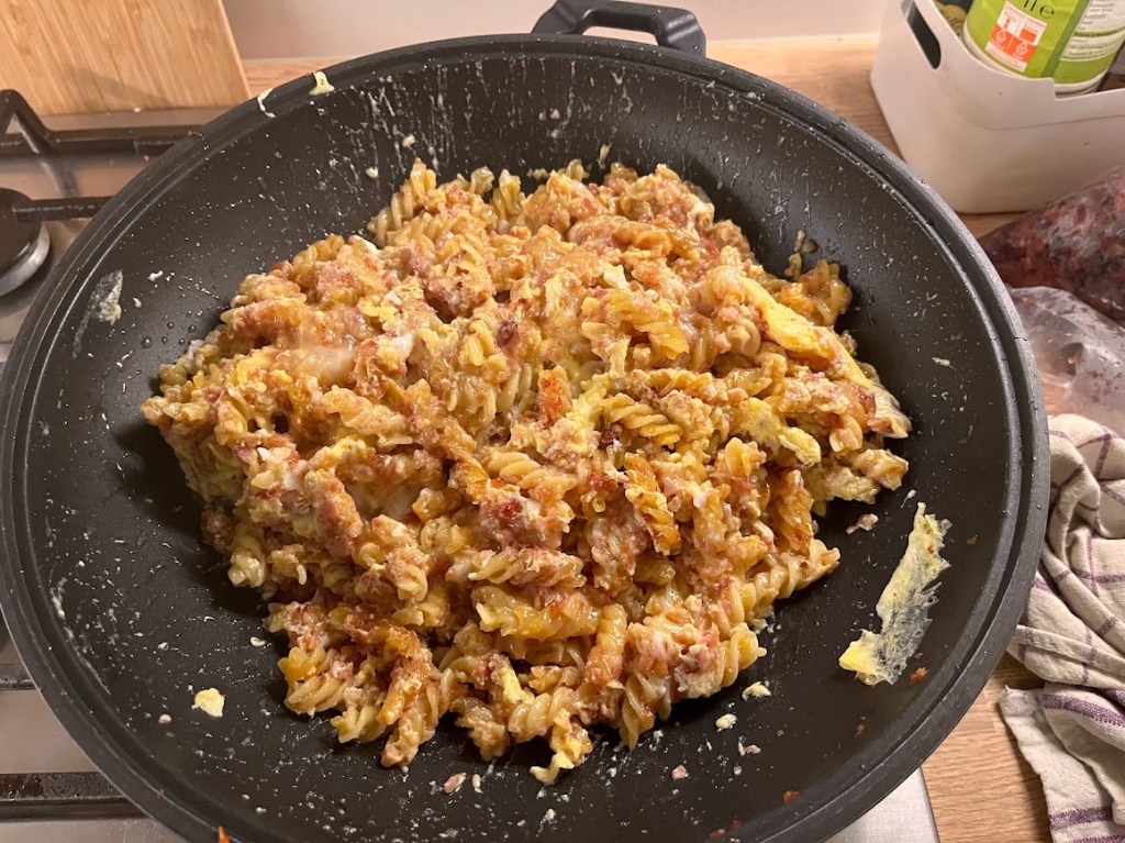 Das Ei soll nicht ganz stocken, sondern noch ein ganz klein wenig flüssig bleiben, so dass die Nudeln nicht zu trocken werden.