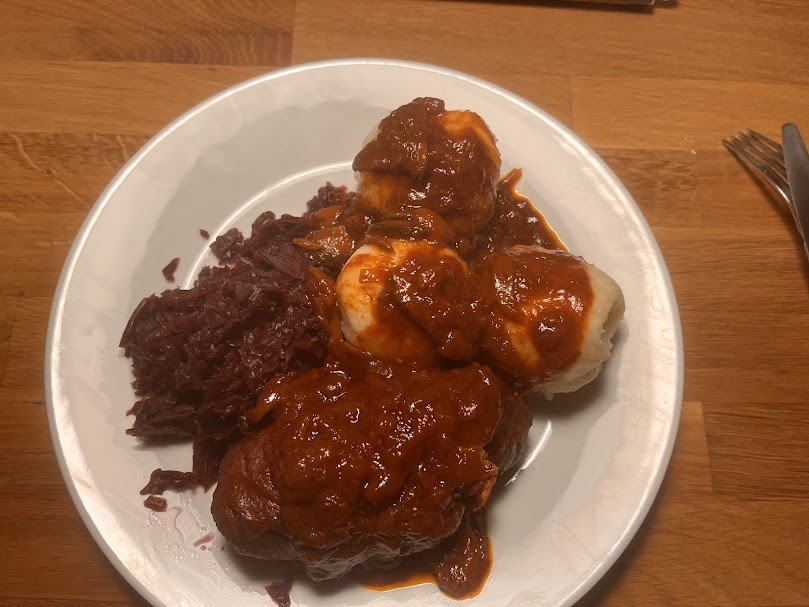 Dazu gab es bei mir dann Knödel aus dem Kochbeutel und Rotkraut aus dem Glas. Für mich alleine, wollte Ich da nun nicht auch noch bei den Beilagen so einen Aufwand betreiben, schliesslich wollte Ich auch noch was von meinem Sonntag haben.