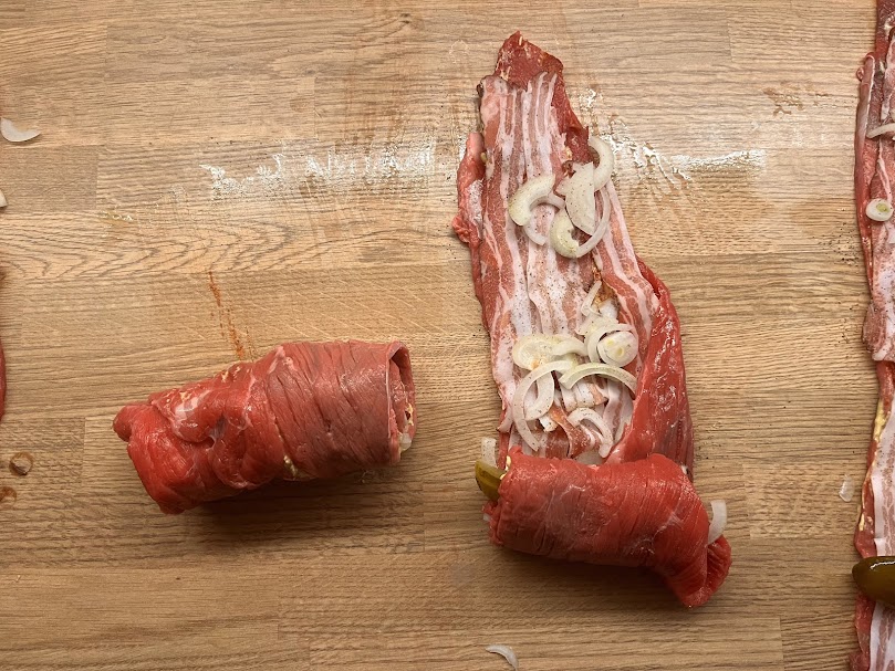 Dort wo das Fleisch etwas unförmig das Stück in die Mitte einklappen und dann von unten von der Gurke her anfangen die Rouladen zu rollen.