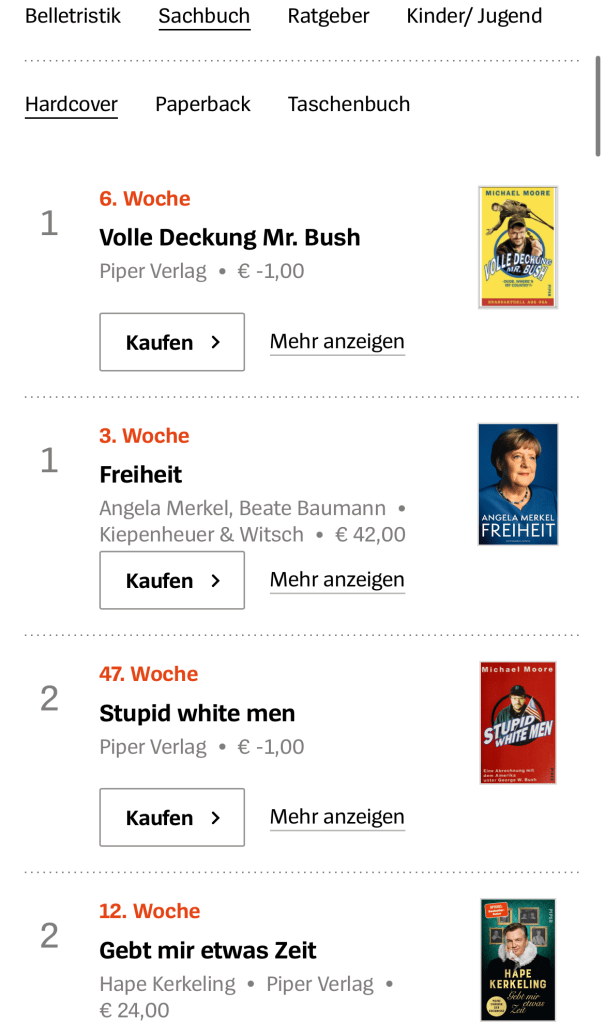 Ja, was war denn da Mitte Dezember auf einmal in der Spiegel Bestsellerliste Sachbuch los (Ich arbeite grad meine ca. 1.000 Mails auf die sich seit Anfang Dezember in meinem Postfach angesammelt haben und zu deren Bearbeitung Ich bisher noch keine Lust hatte und unter denen auch ne Mail war die Ich mir selber geschrieben hab und in der Ich mich darin erinnern wollte dass man über diese kuriose Liste was schreiben könnte).
