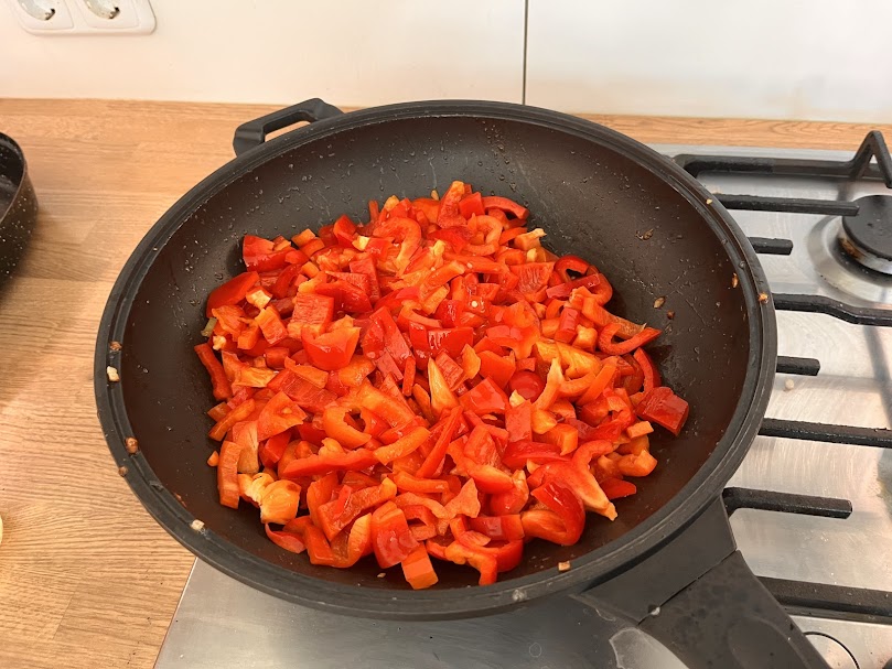 Paprika grob würfeln und in der Pfanne anbraten, bis sie eine leichte Bräune haben und in den Topf geben