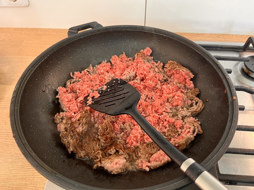 Hackfleisch anbraten, bis es schön dunkelbraun und krümelig ist und in den Topf geben