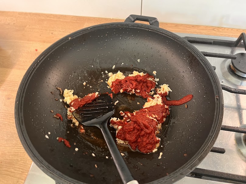 Knoblauch pressen und zusammen mit dem Tomatenmark leicht anrösten, bis es ein bisschen Farbe hat
