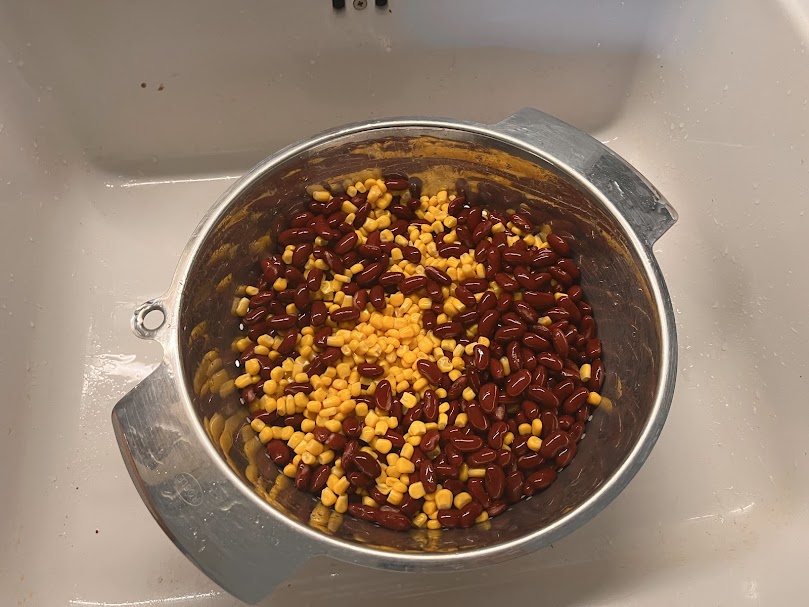 Bohnen und Mais in ein Sieb geben und im Waschbecken gut abspülen
