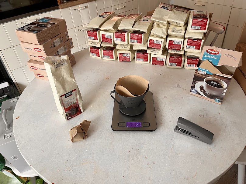 Ich nehme dazu eine Küchenwaage, einen Kaffeefilterhalter, Kaffeefilter und einen Tacker.
