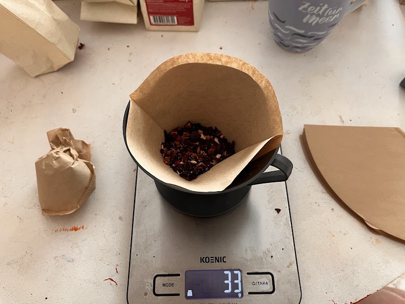 Dann wiege Ich den Tee ab und tackere die Kaffeefilter zu.